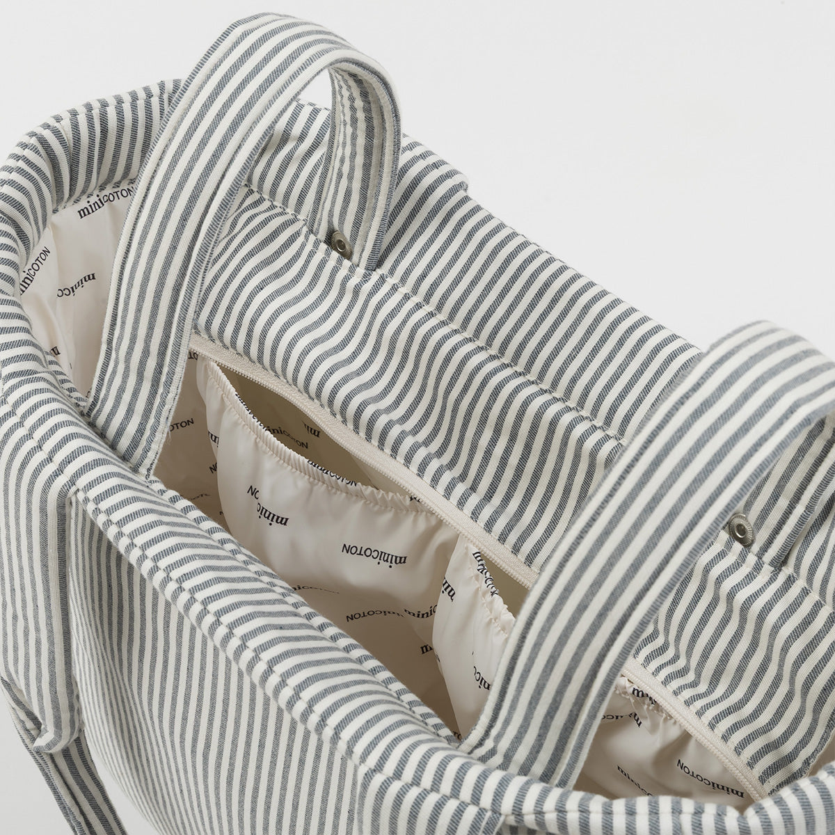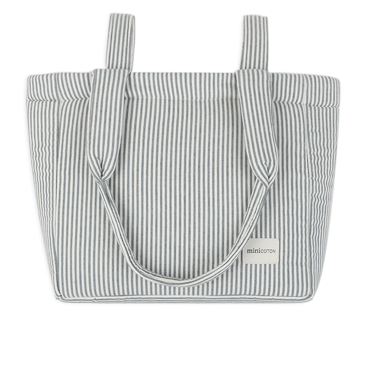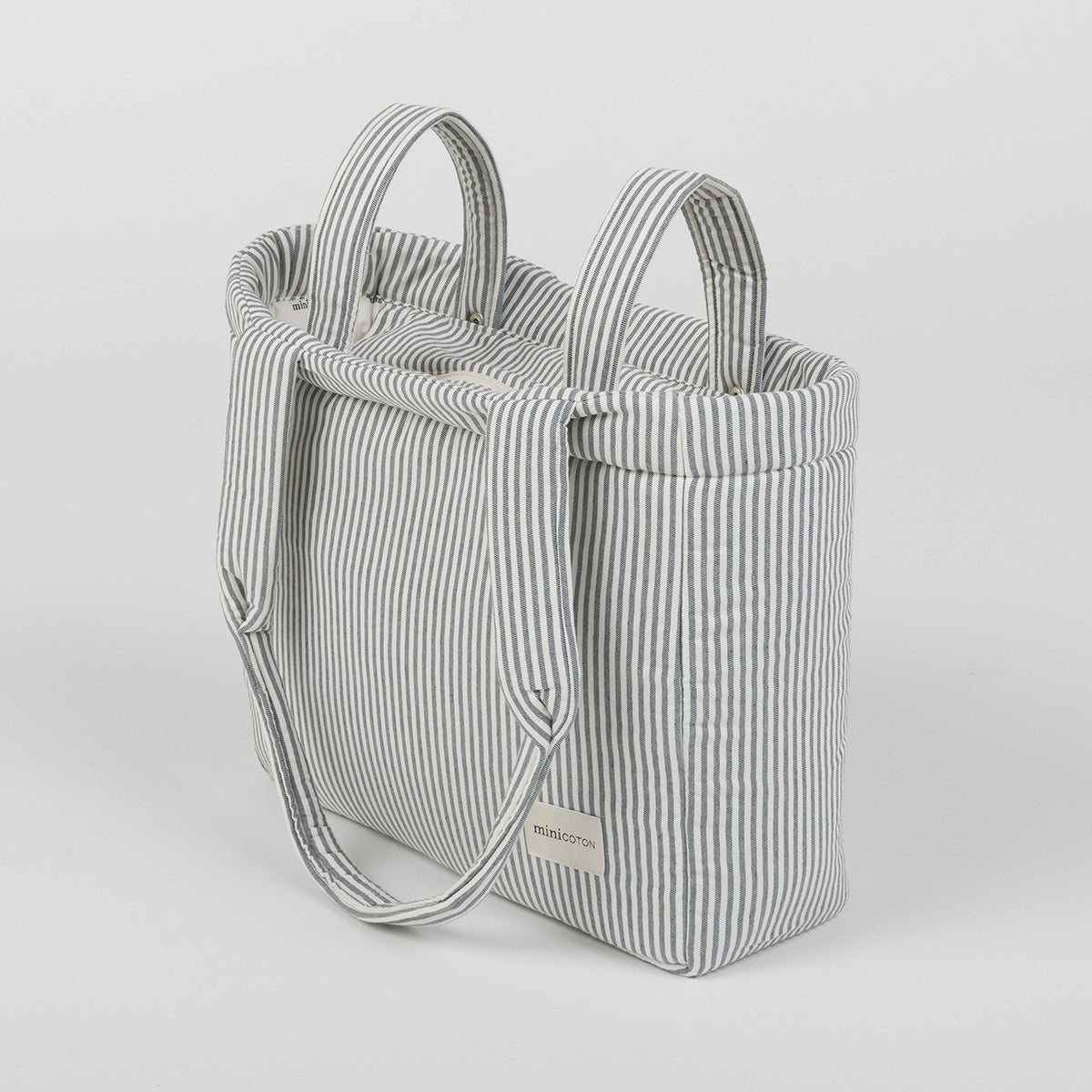 Una bolsa espaciosa y muy ligera. Con cintas para el manillar del cochecito que se esconden a través de sus ojales, para convertirse en un práctico tote para llevar al hombro. Con dos bolsillos interiores y cierre con cremallera. El exterior es 53% algodón y 47% Recycled Denim.