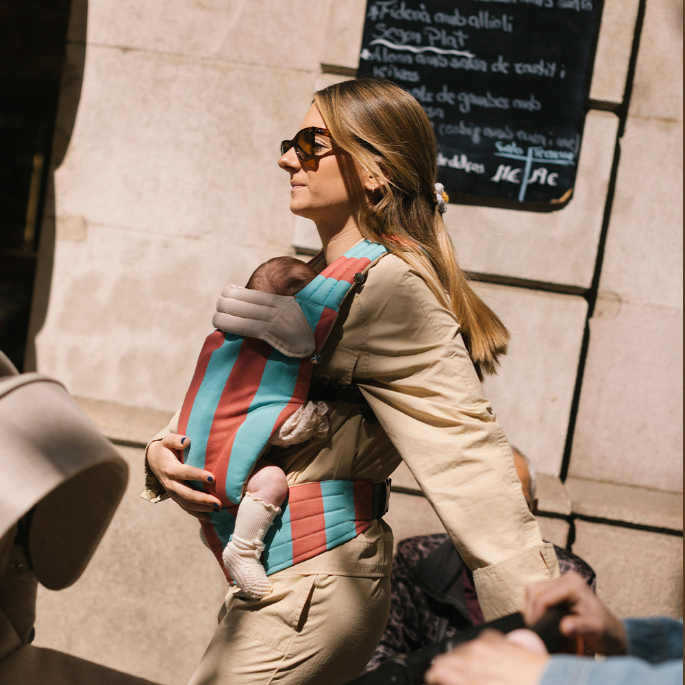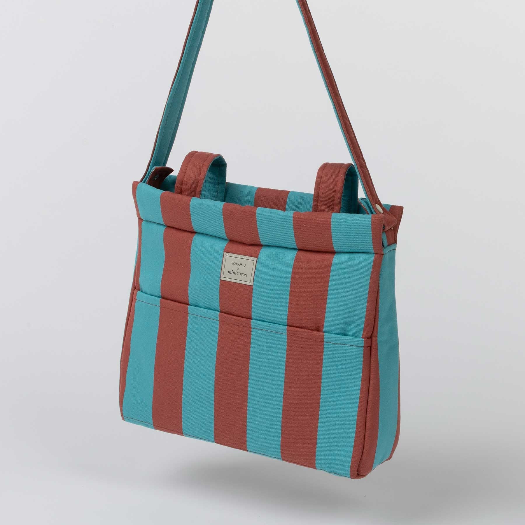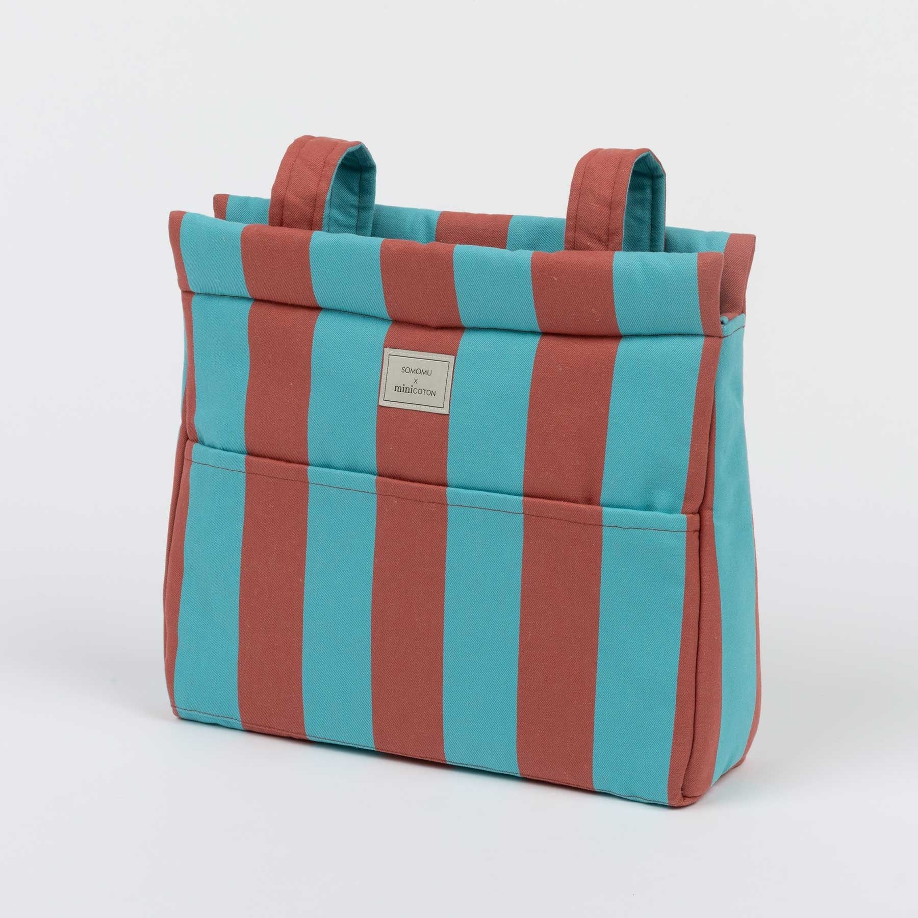 Nuestra bolsa Icon para el cochecito es muy ligera. Está acolchada, por lo que los productos de su interior están protegidos. Tiene el interior de rizo con dorso impermeable para que, si se vuelca algún líquido, empape y no traspase. Se sujeta al cochecito con dos cintas que se abrochan con botón de click. También tiene una bandolera quita y pon, que también se ajusta con botón de click, para llevarla cómodamente al hombro o como bolso cruzado. Se cierra con cremallera tanto la parte superior, como su bolsillo delantero.