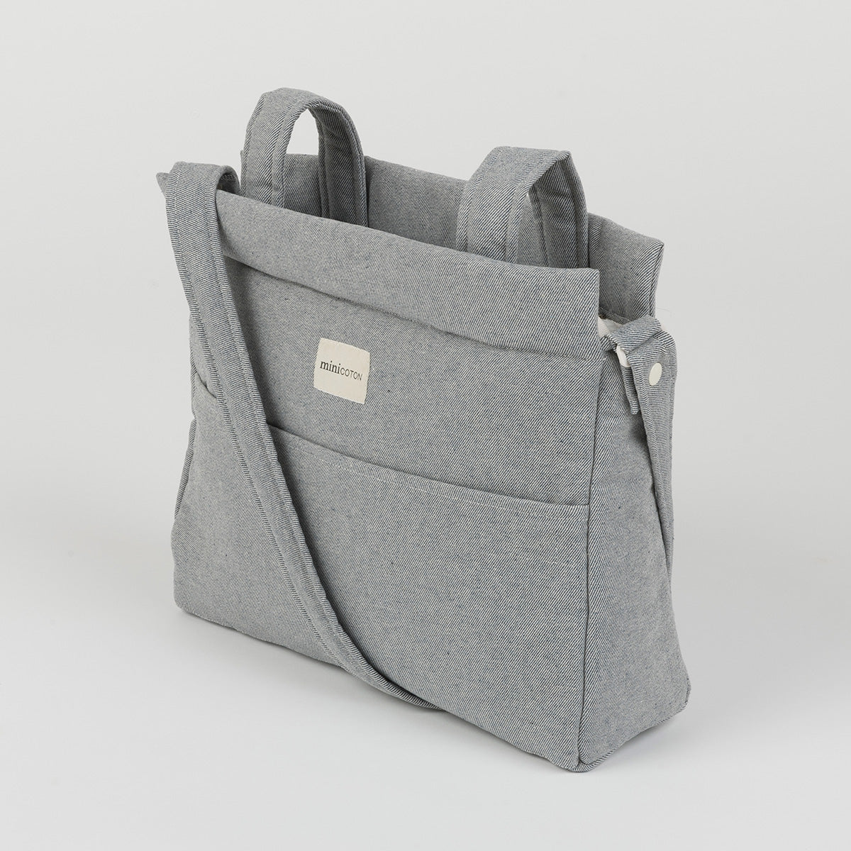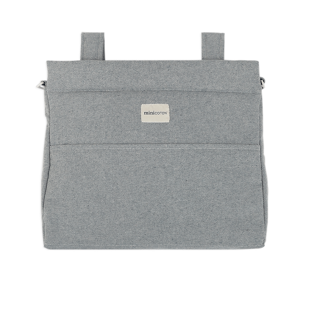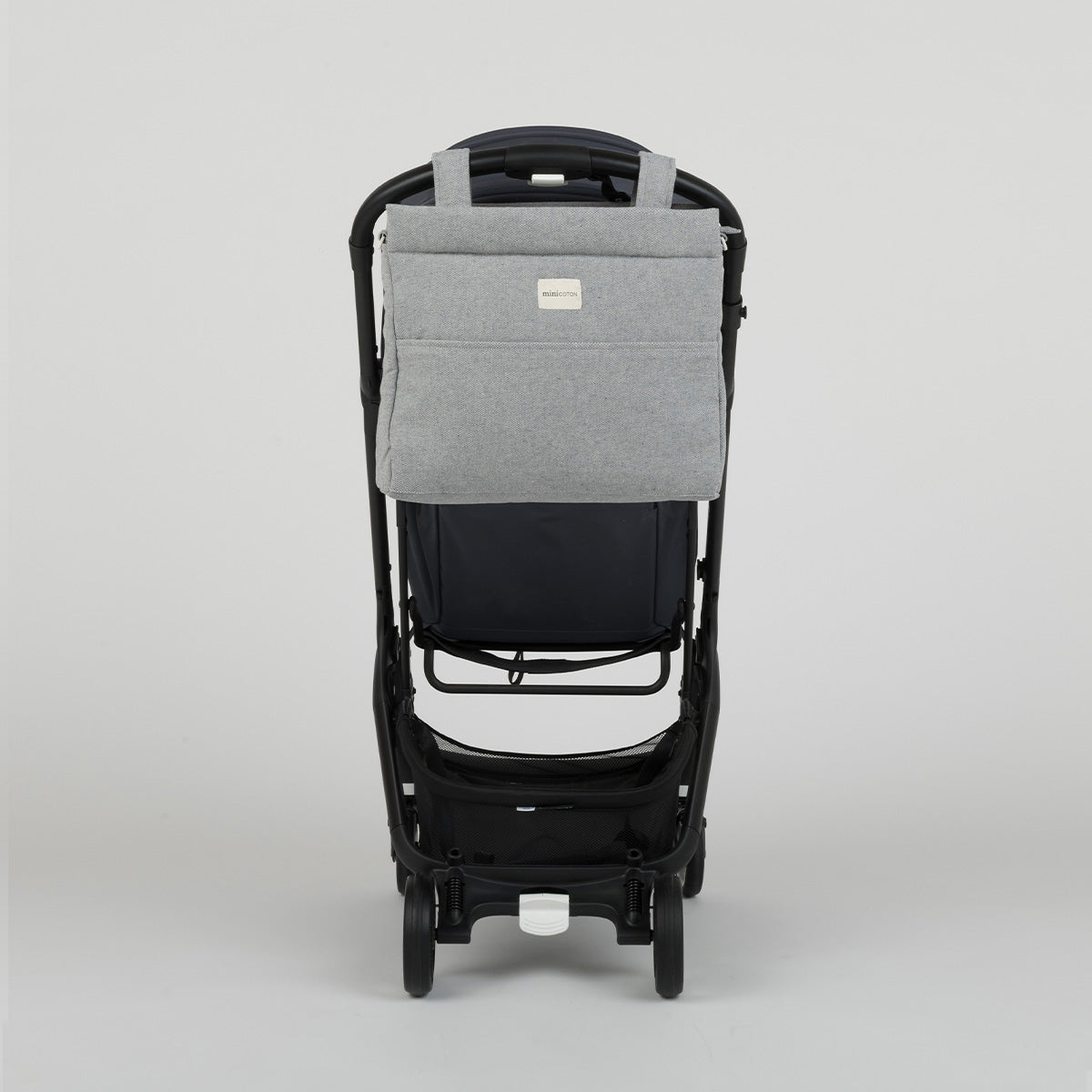 Nuestra bolsa Icon para el cochecito es muy ligera. Está acolchada, por lo que los productos de su interior están protegidos. Tiene el interior de rizo con dorso impermeable para que, si se vuelca algún líquido, empape y no traspase. Se sujeta al cochecito con dos cintas que se abrochan con botón de click. También tiene una bandolera quita y pon, que también se ajusta con botón de click, para llevarla cómodamente al hombro o como bolso cruzado. Se cierra con cremallera tanto la parte superior como su bolsillo delantero.