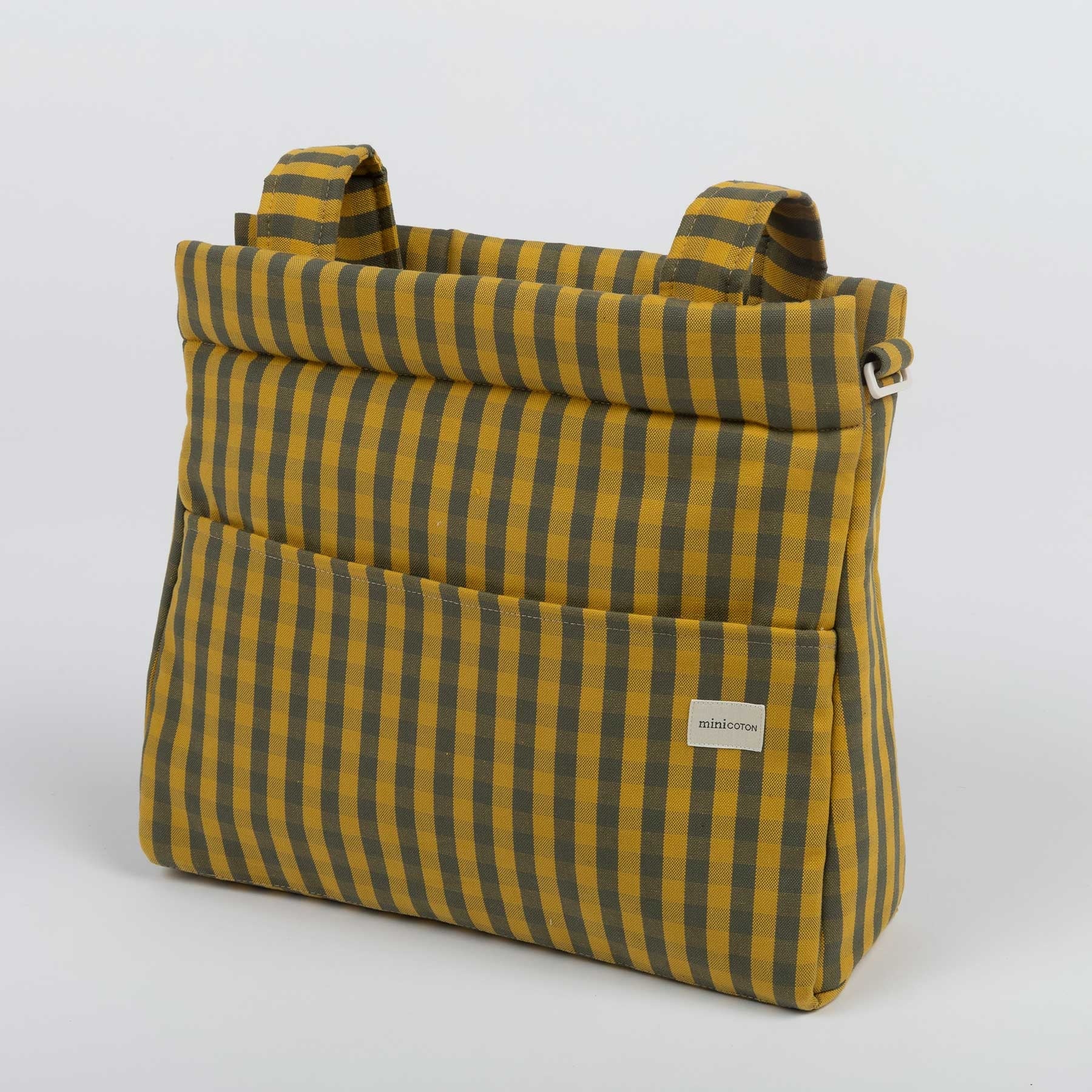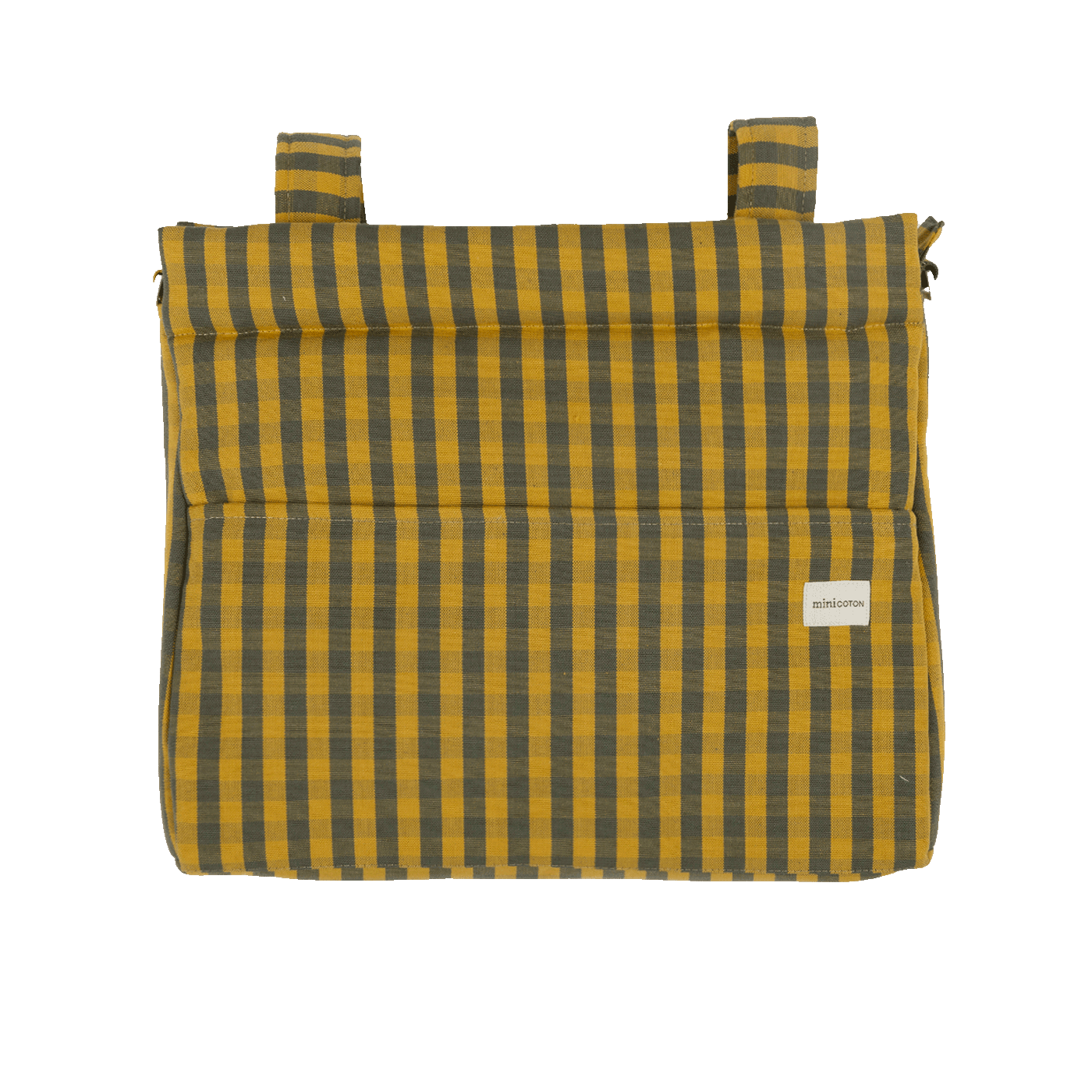 Nuestra bolsa Icon para el cochecito es muy ligera. Está acolchada, por lo que los productos de su interior están protegidos. Tiene el interior de rizo con dorso impermeable para que si se vuelca algún líquido, empape y no traspase. Se sujeta al cochecito con dos cintas que se abrochan con botón de click. También tiene una bandolera quita y pon, que también se ajusta con botón de click, para llevarla cómodamente al hombro o como bolso cruzado. Se cierra con cremallera tanto la parte superior, como su bolsillo delantero.