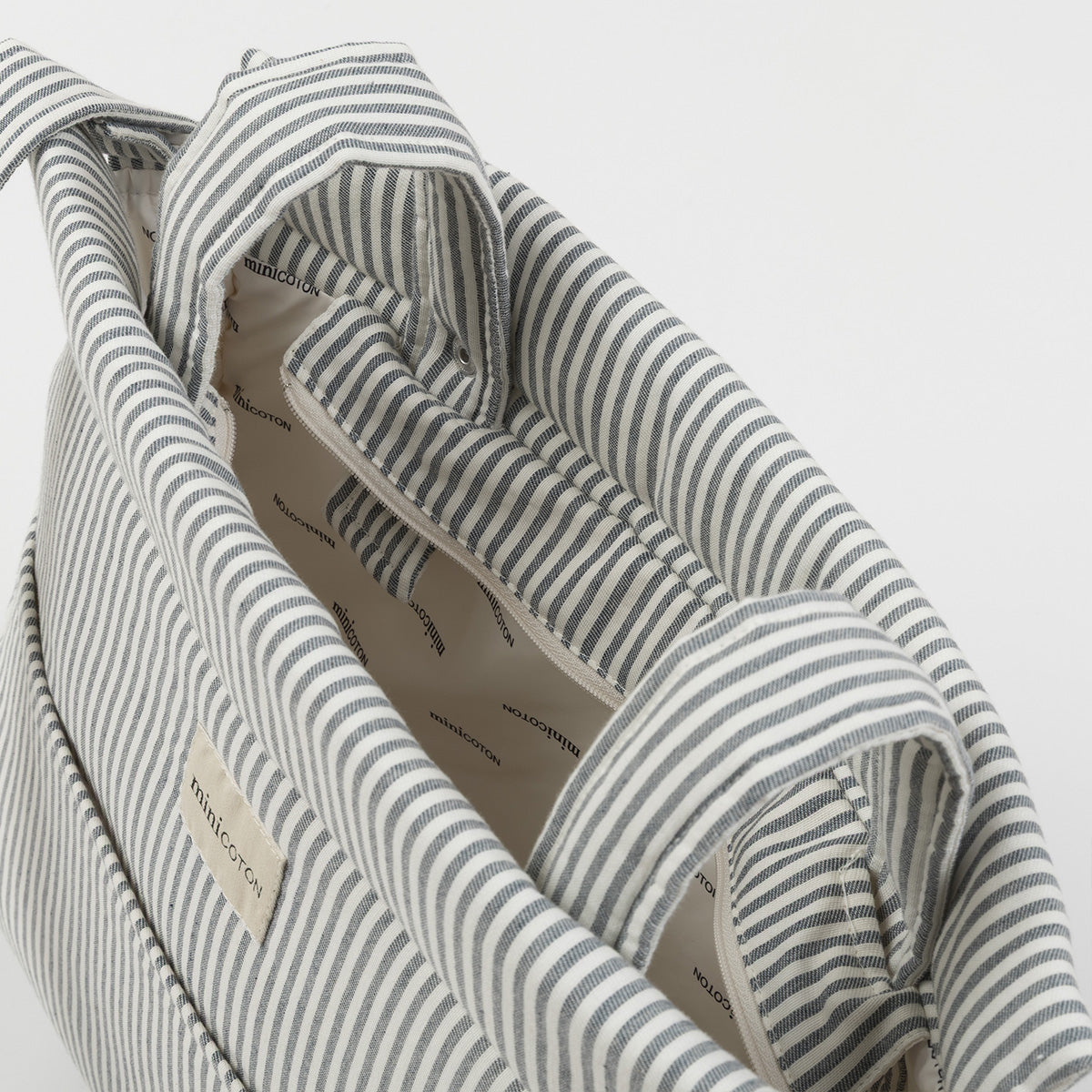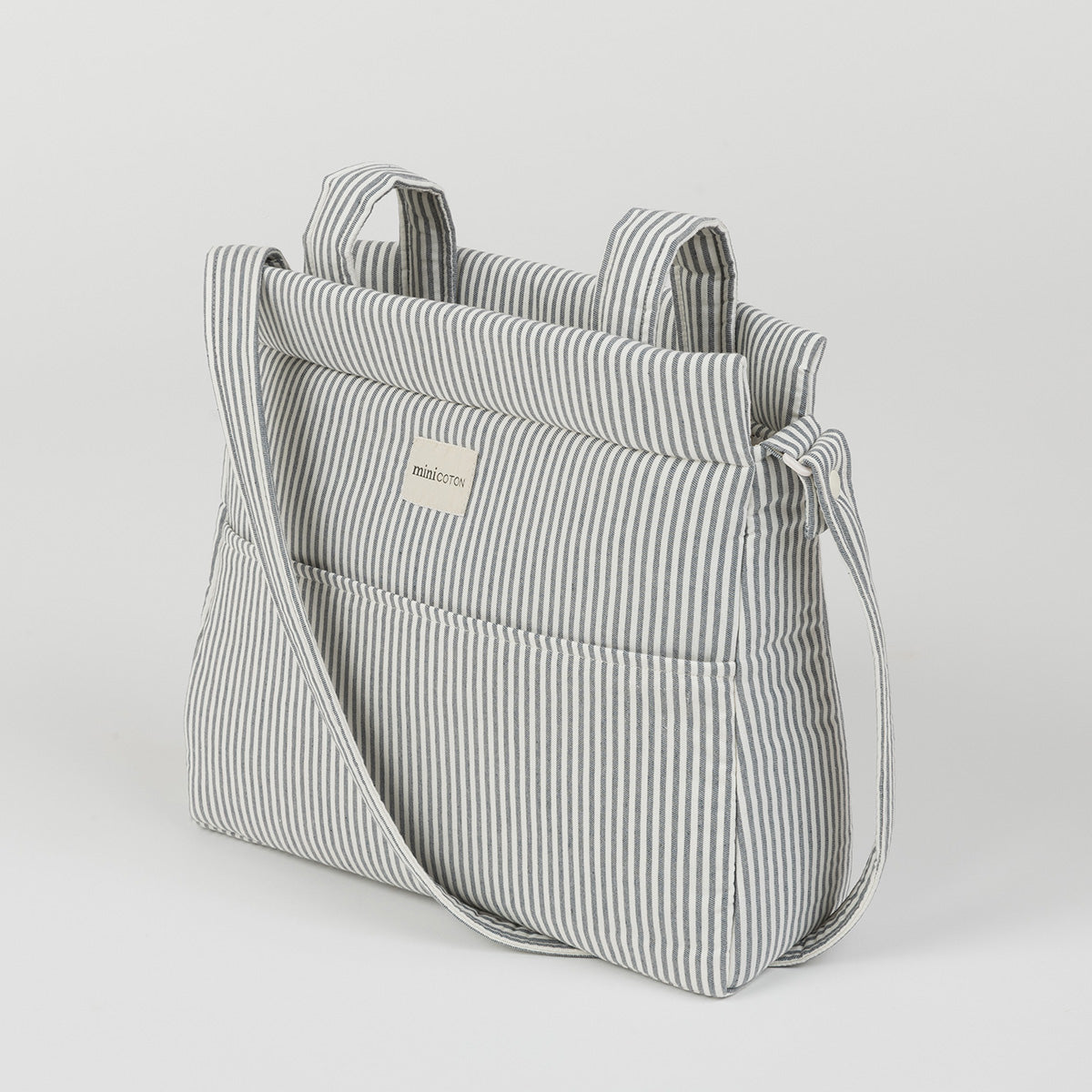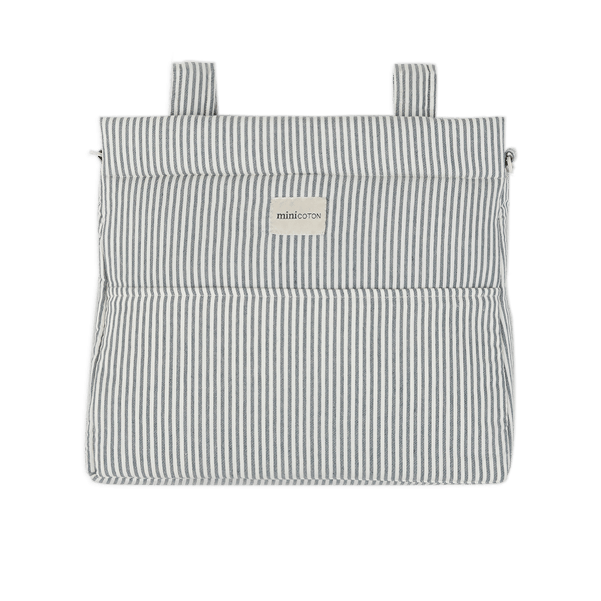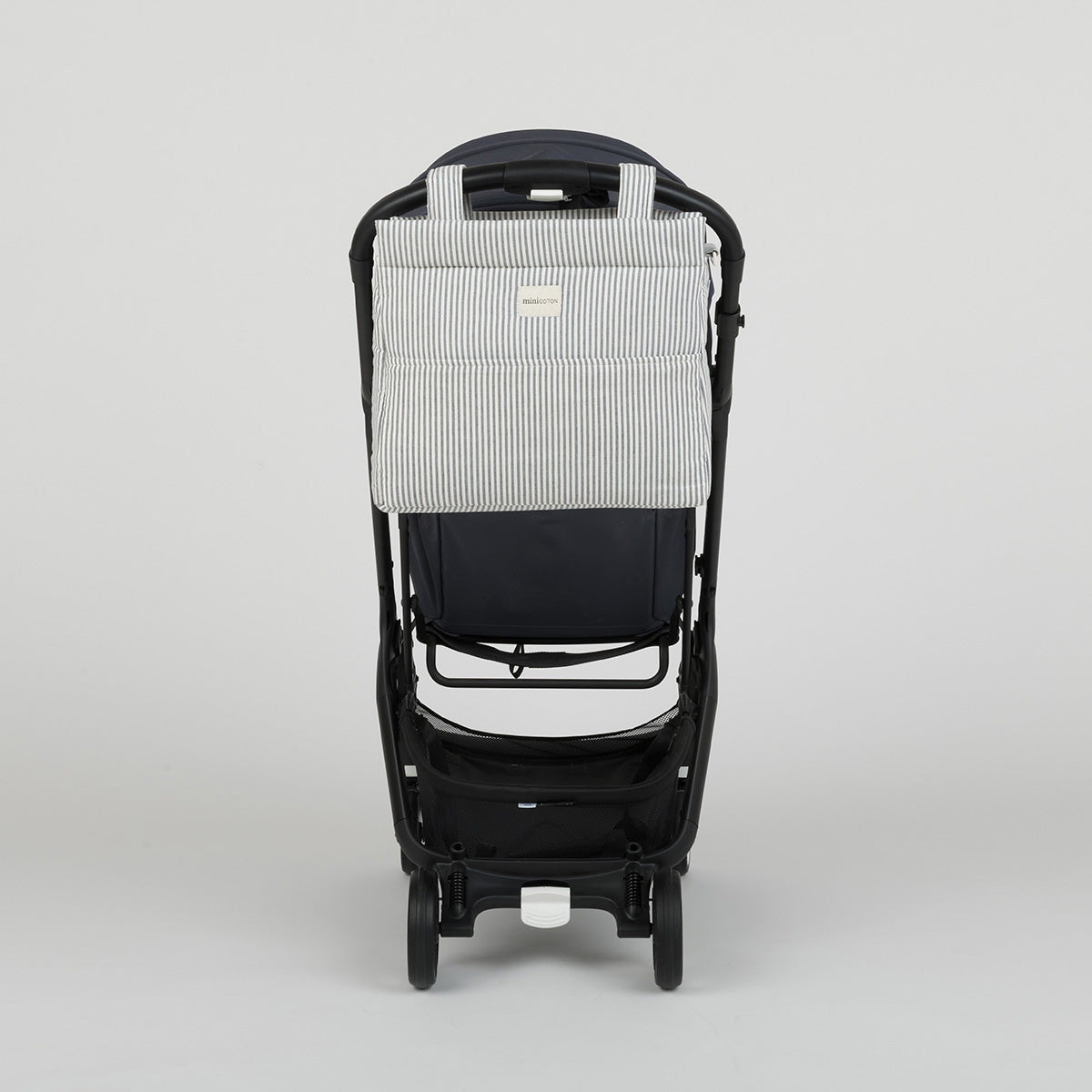 Nuestra bolsa Icon para el cochecito es muy ligera. Está acolchada, por lo que los productos de su interior están protegidos. Tiene el interior de rizo con dorso impermeable para que si se vuelca algún líquido, empape y no traspase. Se sujeta al cochecito con dos cintas que se abrochan con botón de click. También tiene una bandolera quita y pon, que también se ajusta con botón de click, para llevarla cómodamente al hombro o como bolso cruzado. Se cierra con cremallera tanto la parte superior, como su bolsillo delantero.