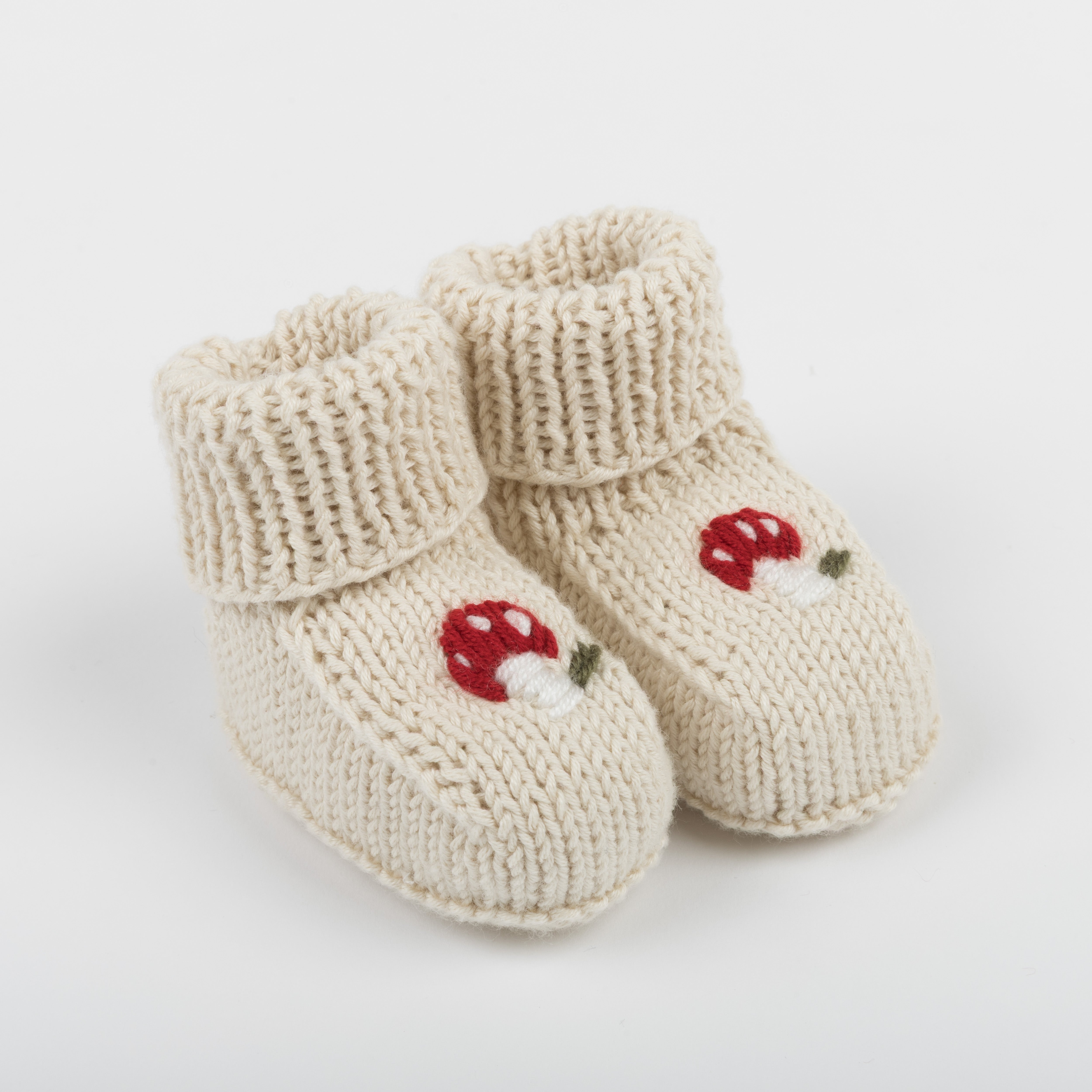 Booties tejidos y bordados a mano en suave punto de algodón con un delicado motivo de seta. Una prenda única para los primeros meses del bebé.