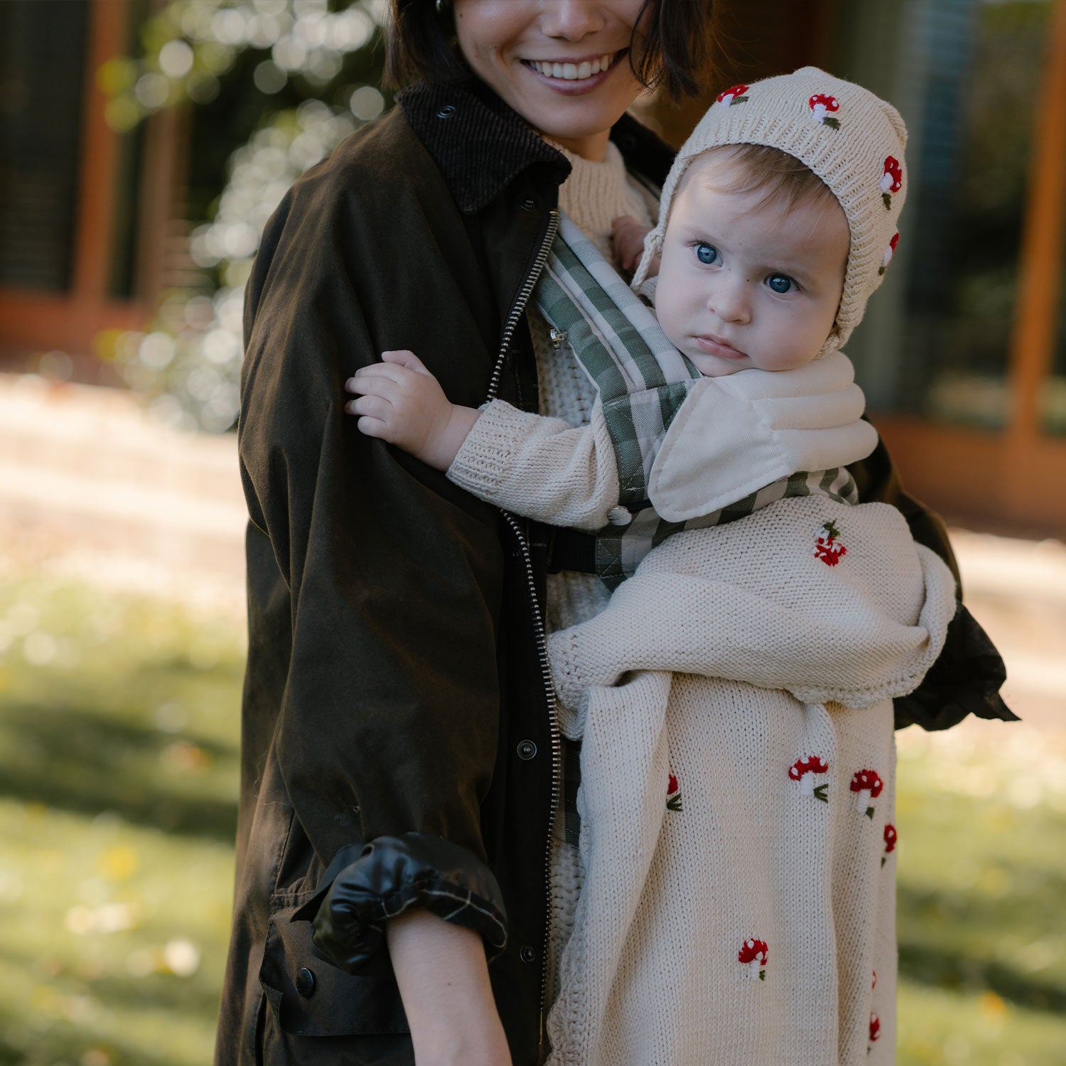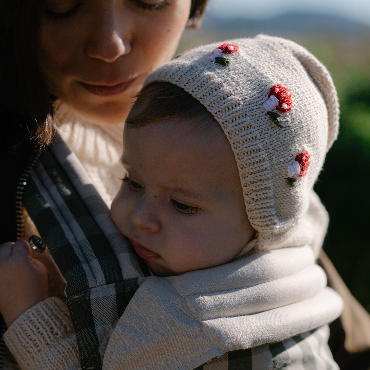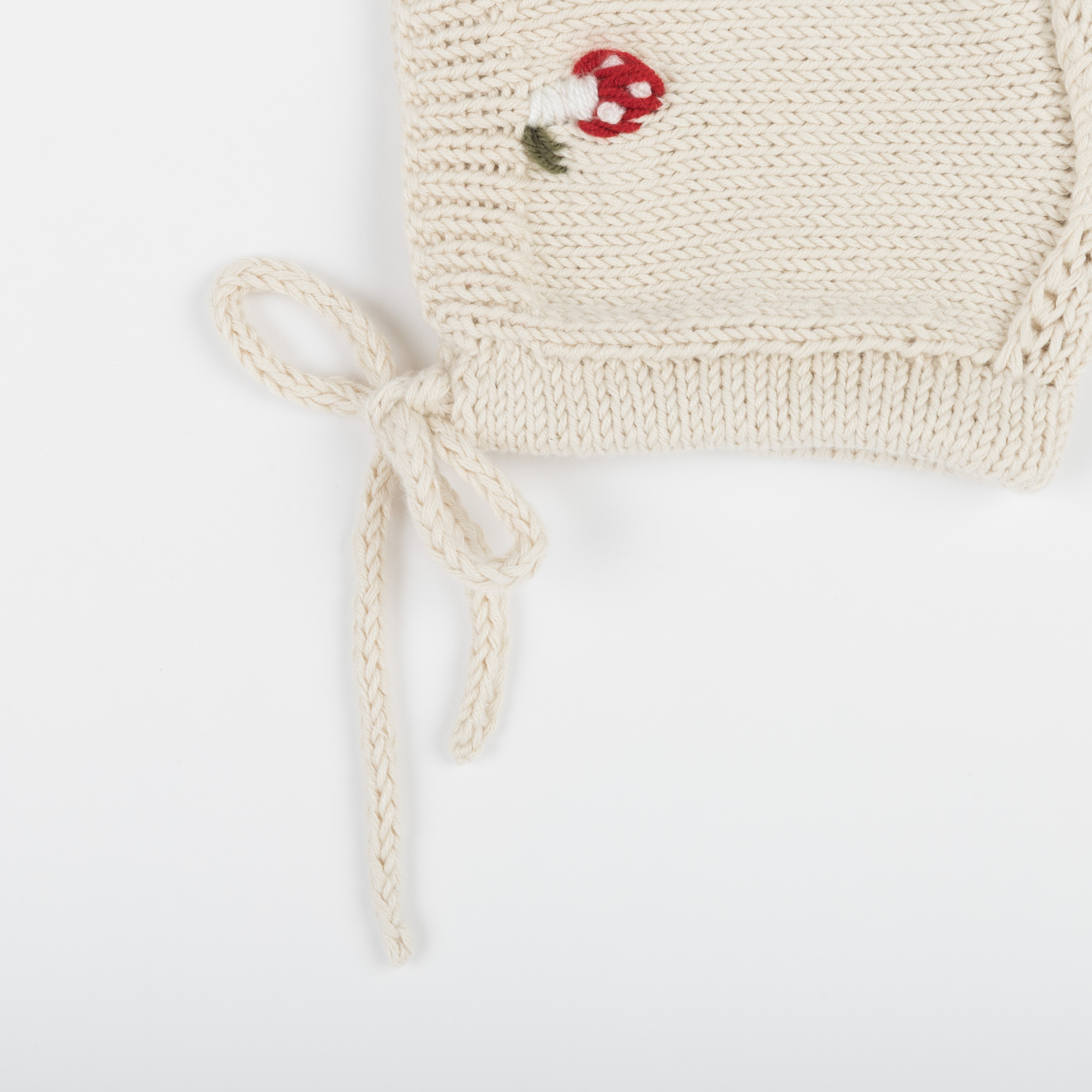 Capota tejida y bordada a mano en suave punto de algodón con un delicado motivo de seta. Una prenda única para los primeros meses del bebé. Se ajusta y ata con un lazo.