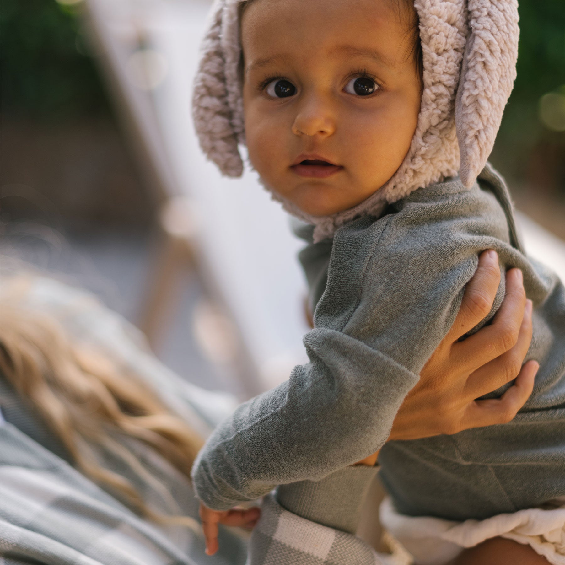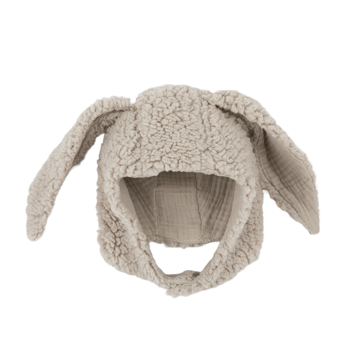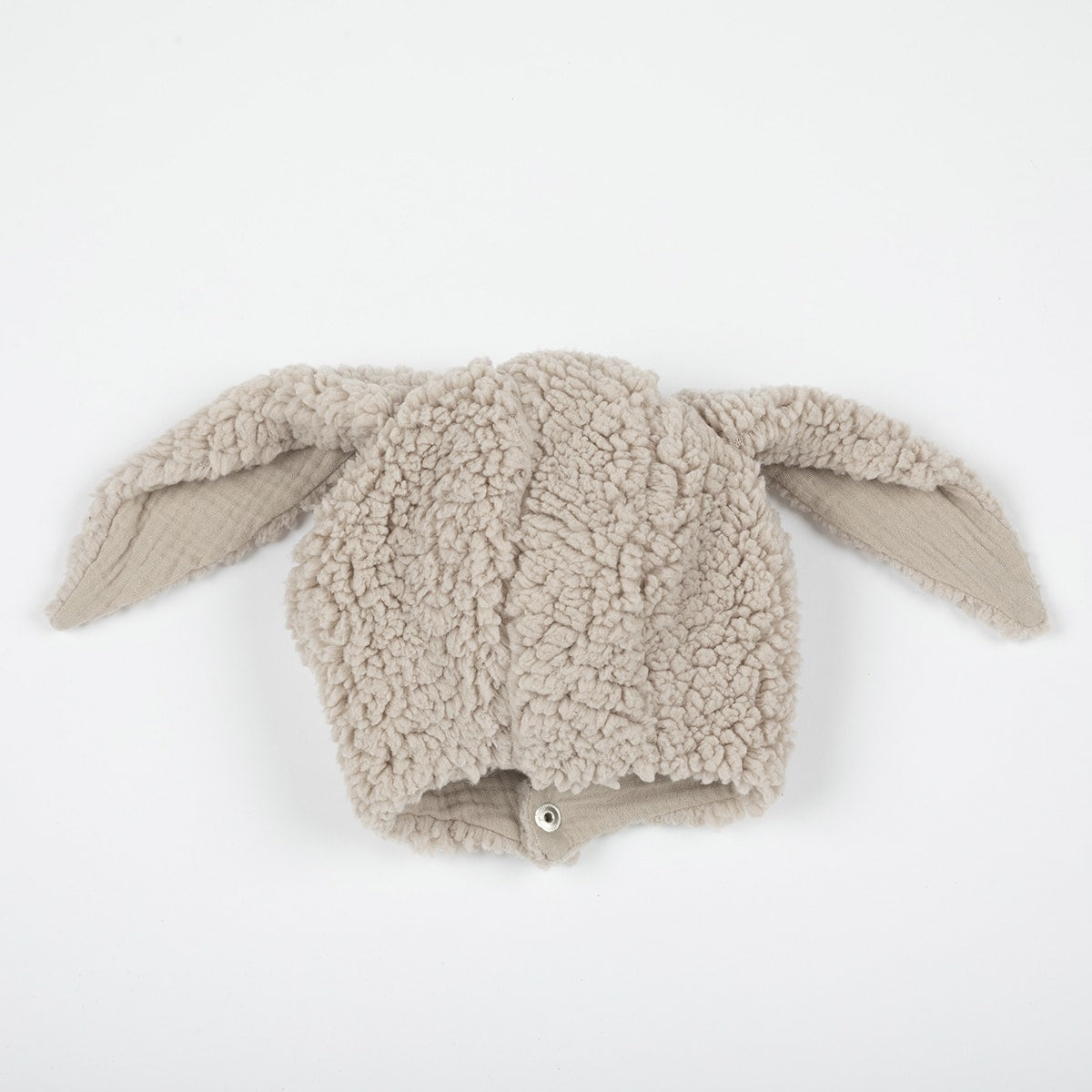 La capota Rabbit tiene orejitas y es de tejido de suave borreguito en el exterior y bambula de algodón orgánico 100%.