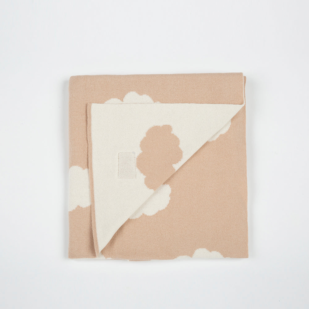 Es reversible, así que ofrece dos mantas en una. Por un lado tiene el fondo rosa con las nubes en color crudo, y por el otro el fondo crudo y las nubes en blush.