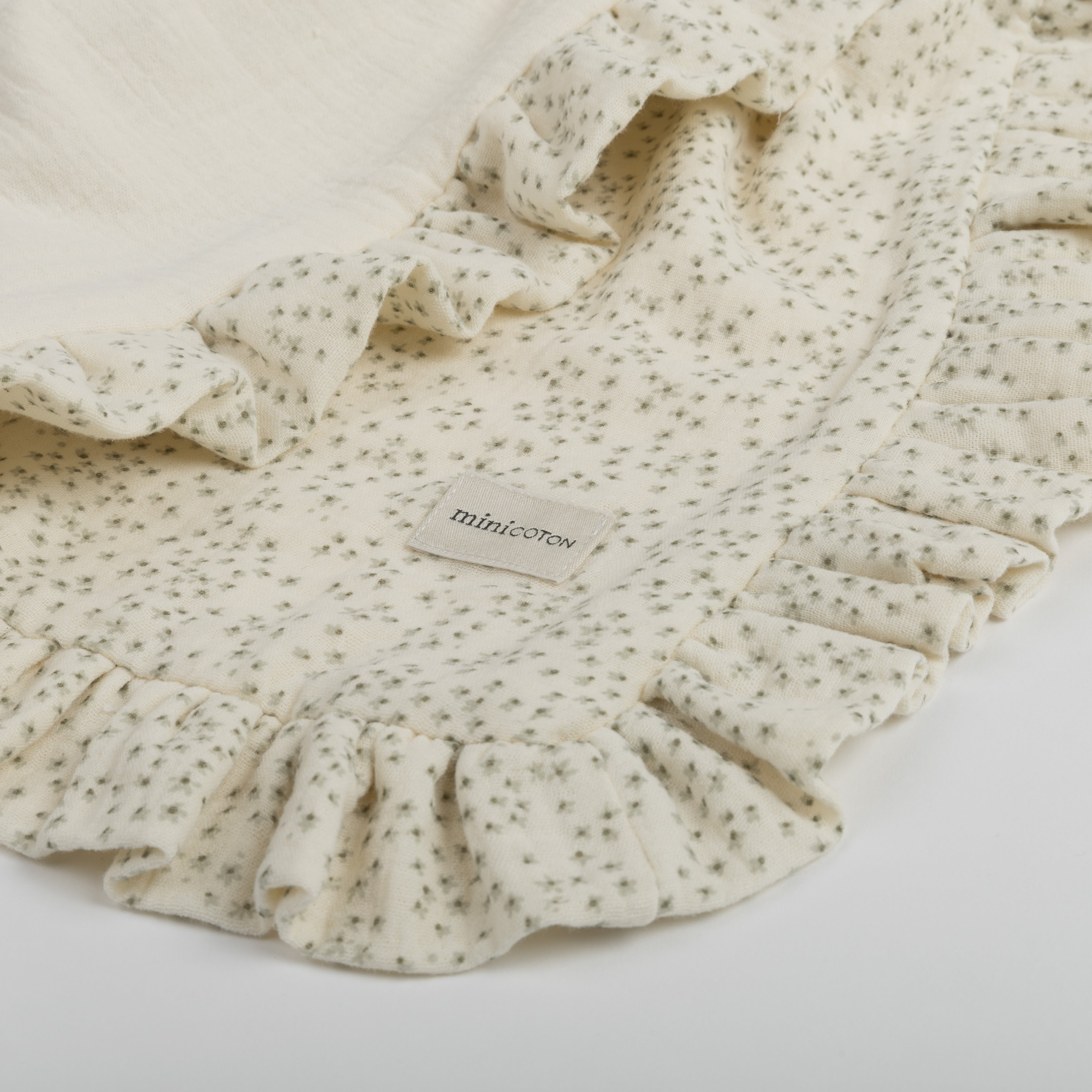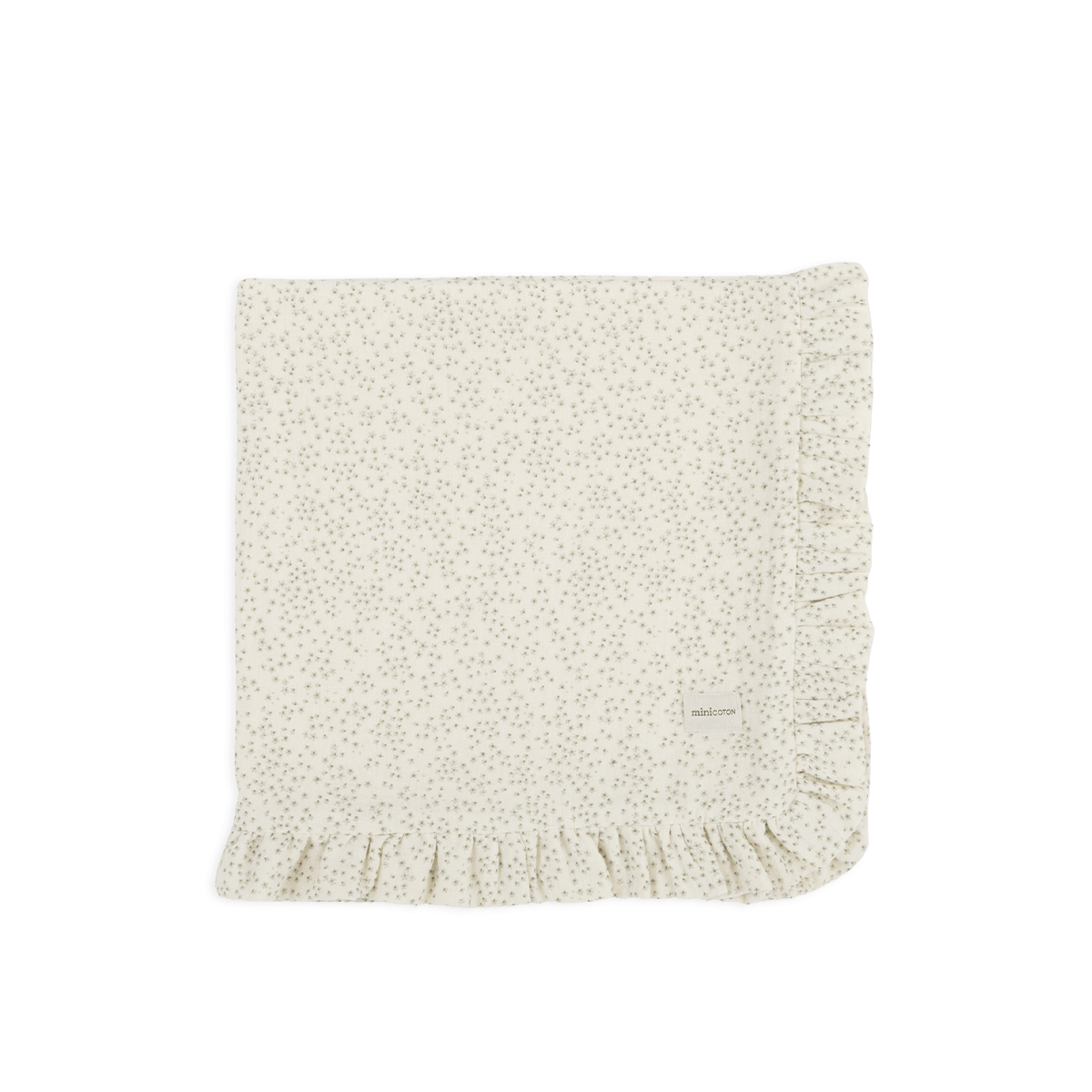 Las muselinas son un imprescindible en la canastilla del bebé, son multiusos y muy prácticas por su transpirabilidad y gran poder de absorción. Esta es doble y sin costuras, con un volante que la rodea.