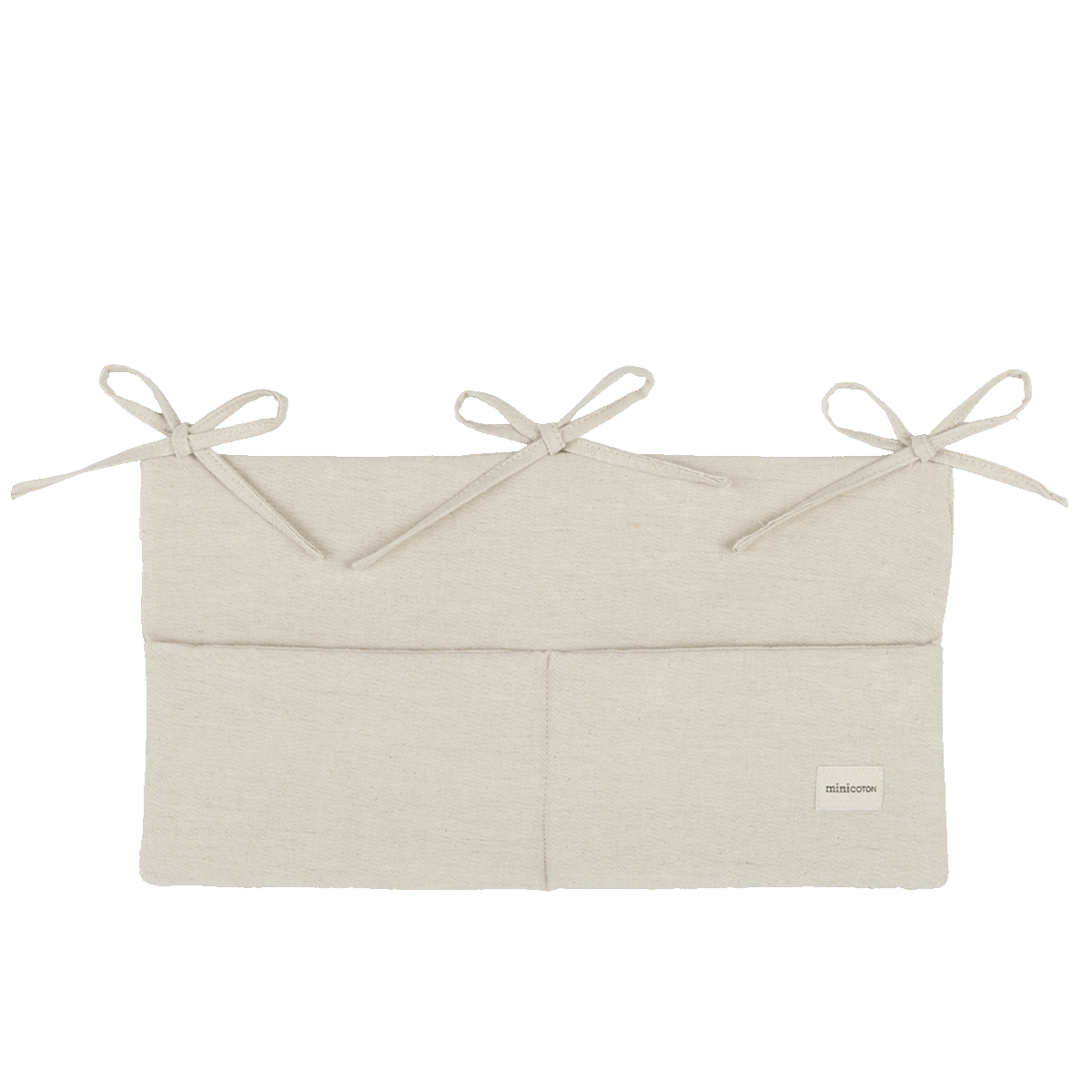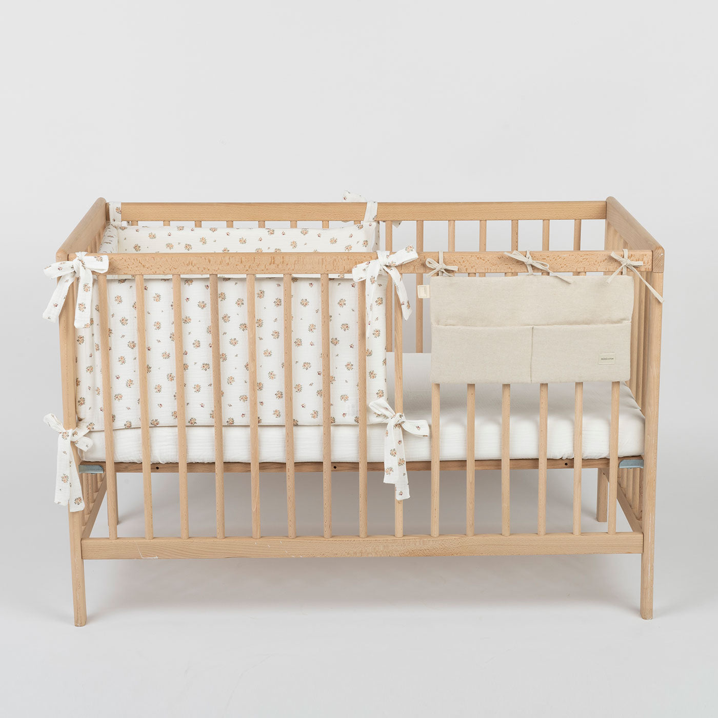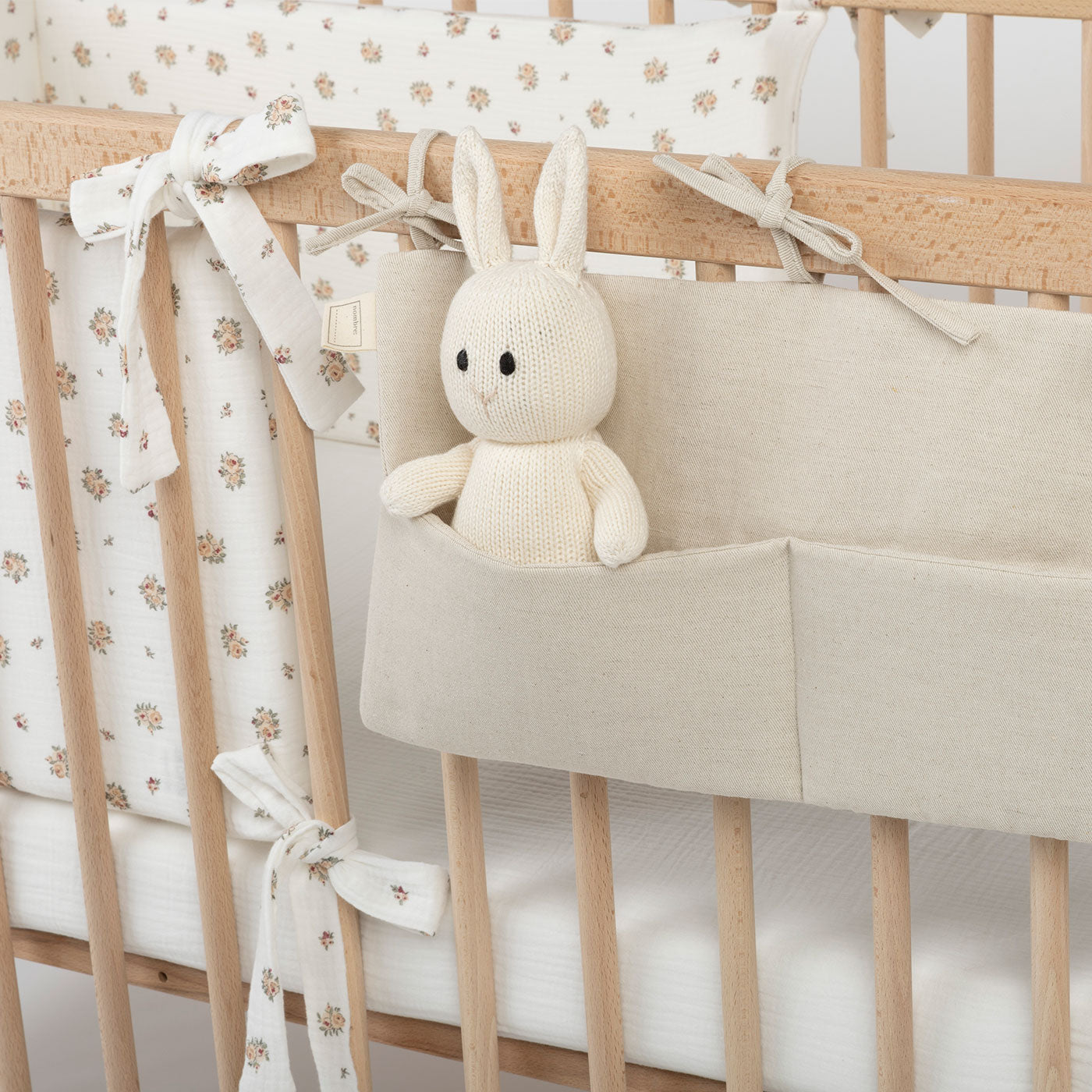 Organizador para cunas. Se ata con tres cintitas a la cuna. Los dos bolsillos te permitirán tener a mano las cositas para tu bebé: chupetes, pañales, pijamitas...