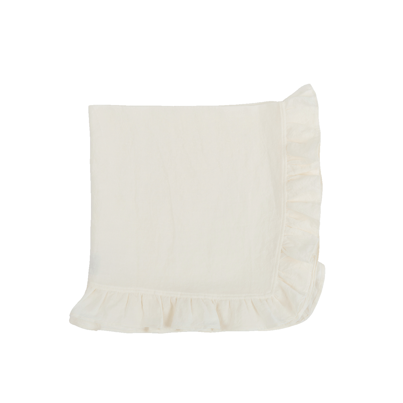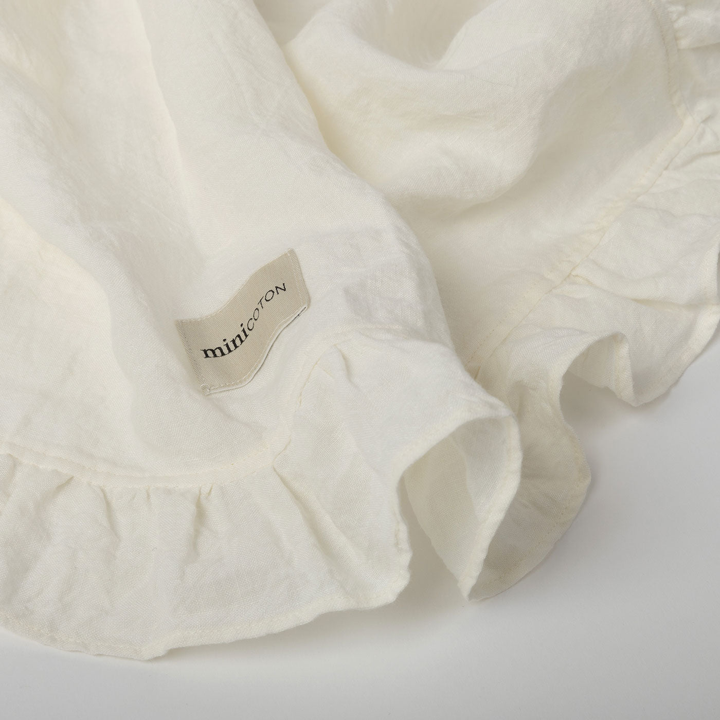 Las mantas son un imprescindible en la canastilla del bebé. Esta es muy ligera, de 100% lino, con un volante que la rodea.