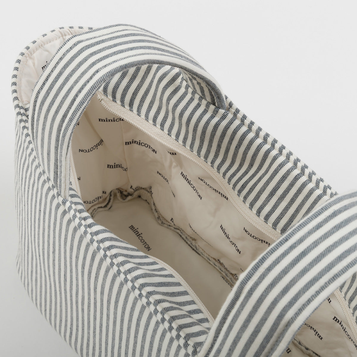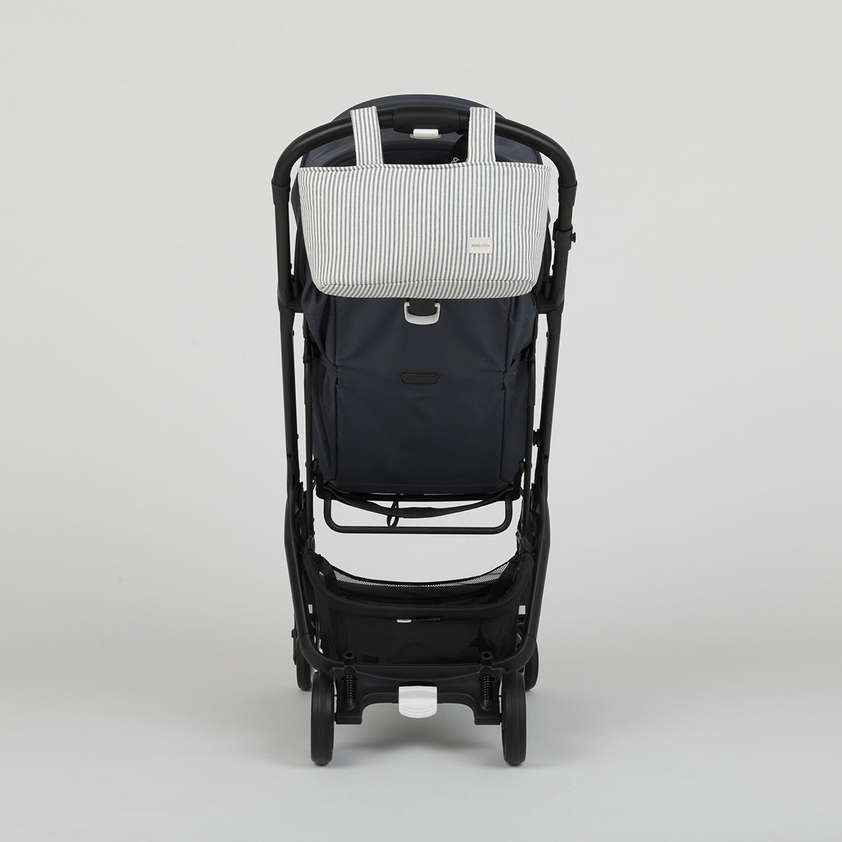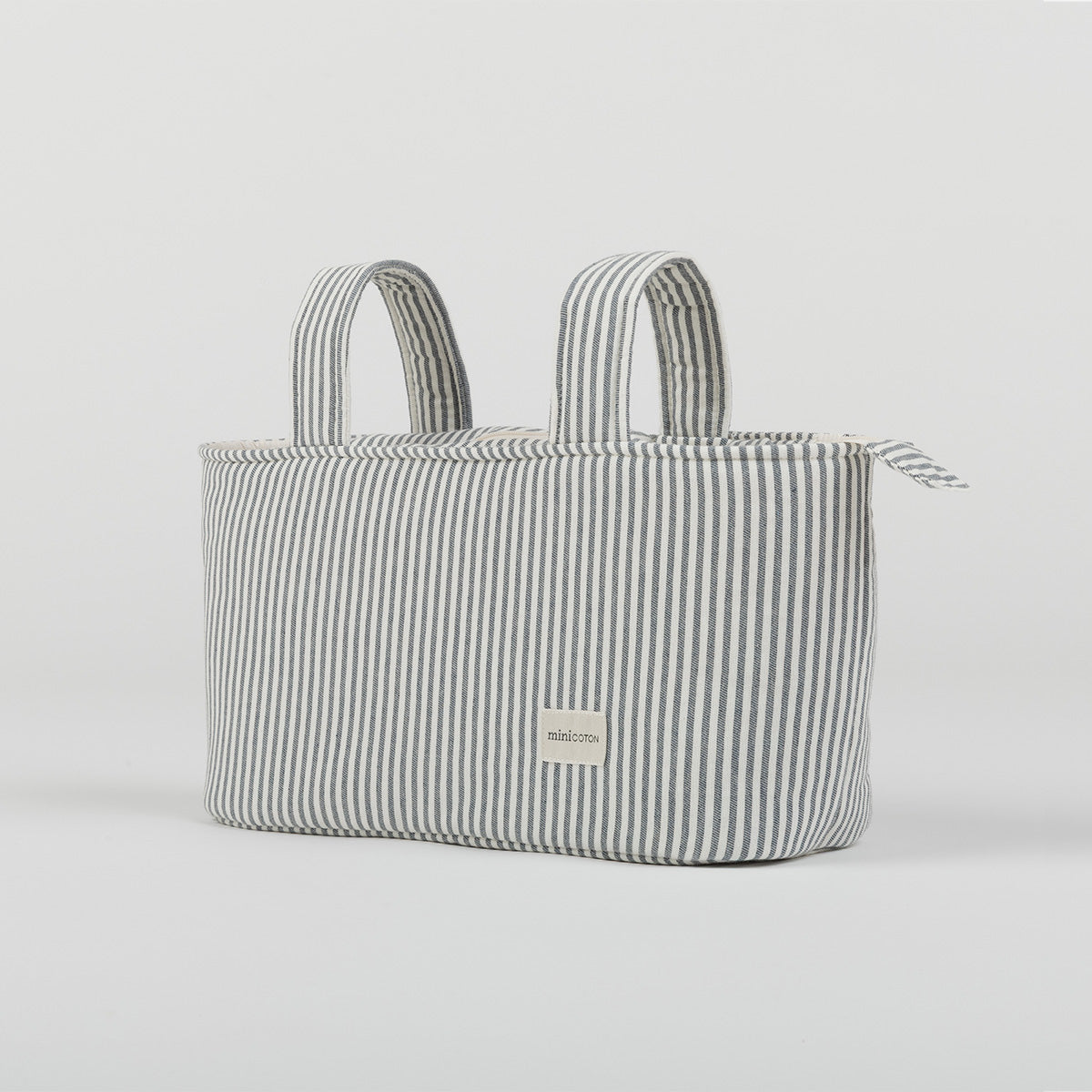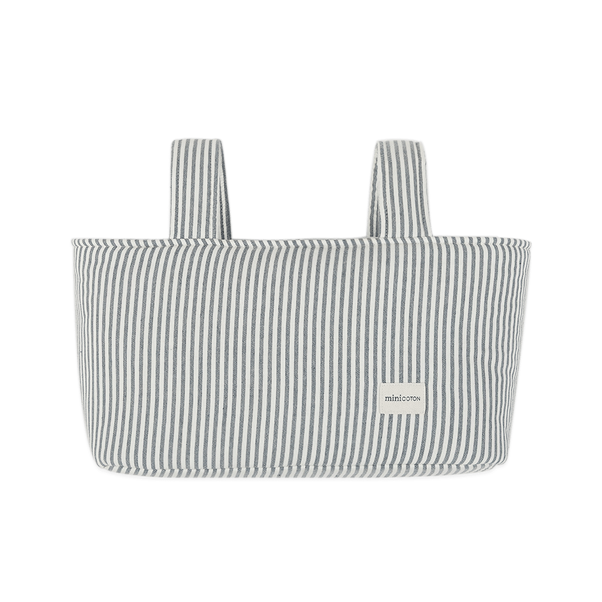Esta es nuestra bolsa Pocket para cochecito. Es muy ligera, con cremallera y dos bolsillitos interiores. Está acolchada, por lo que los productos de su interior están protegidos. Se ajusta con broches automáticos al manillar del cochecito. El tejido exterior es 53% algodón y 47% Recycled Denim.