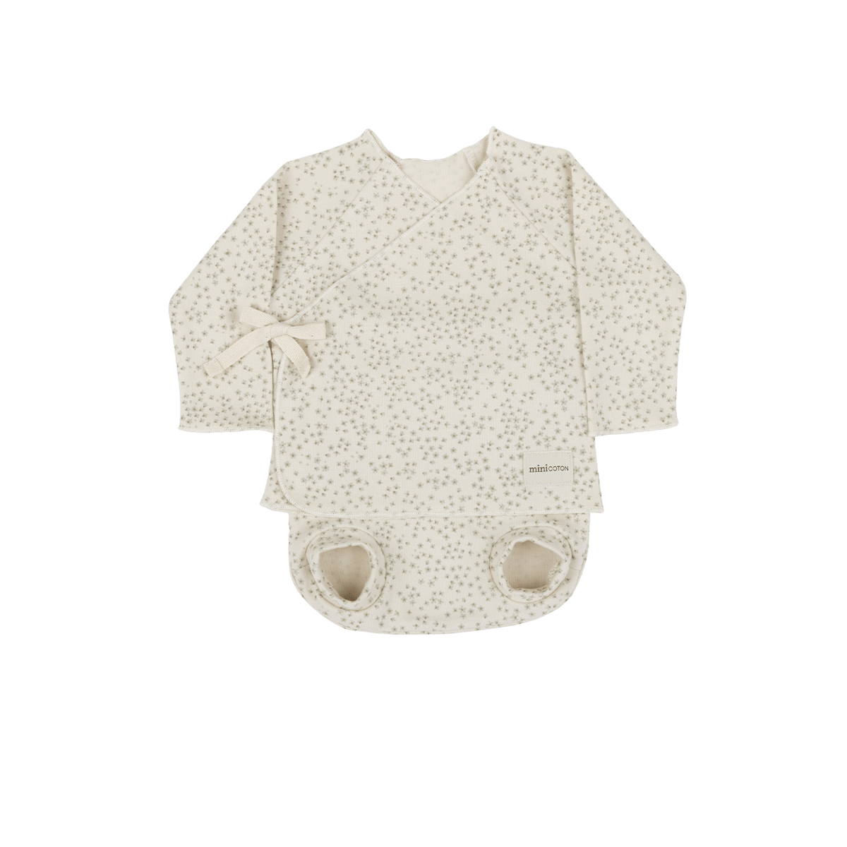 Primera puesta, un imprescindible en la bolsa de la clínica. Set compuesto por top cruzado y culote. Confeccionado en suave punto de algodón 100%. También puedes encontrar el gorrito a juego.