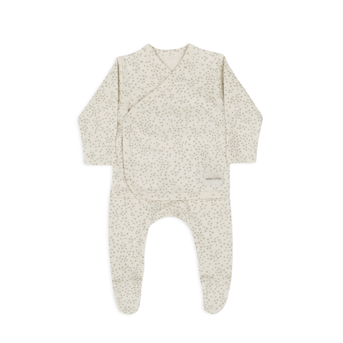 Primera puesta, un imprescindible en la bolsa de la clínica. Set compuesto por camisetita cruzada y polaina. Confeccionado en punto de algodón extra suave. También puedes encontrar el gorrito a juego.