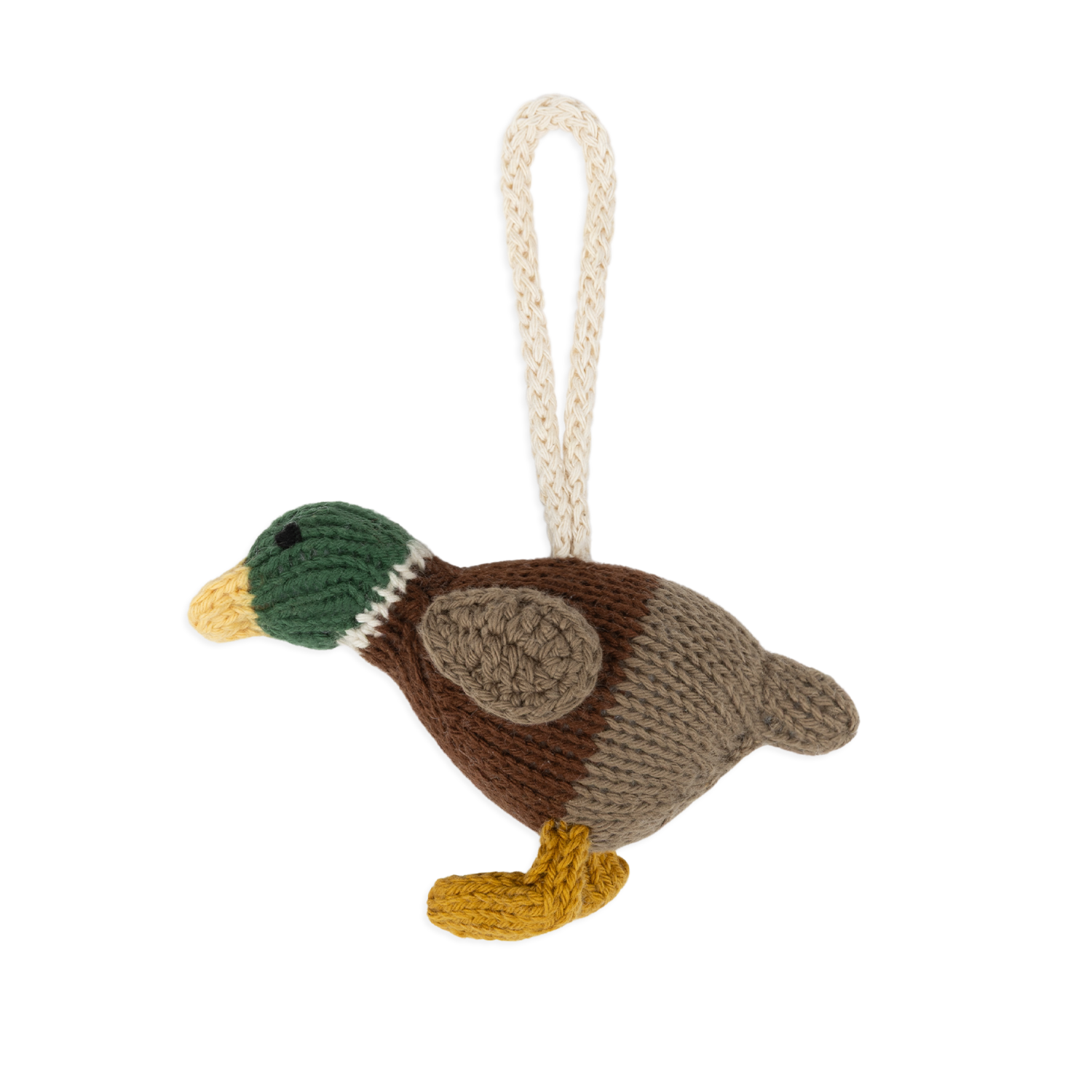 Pato. Em tons de castanho, amarelo e verde.