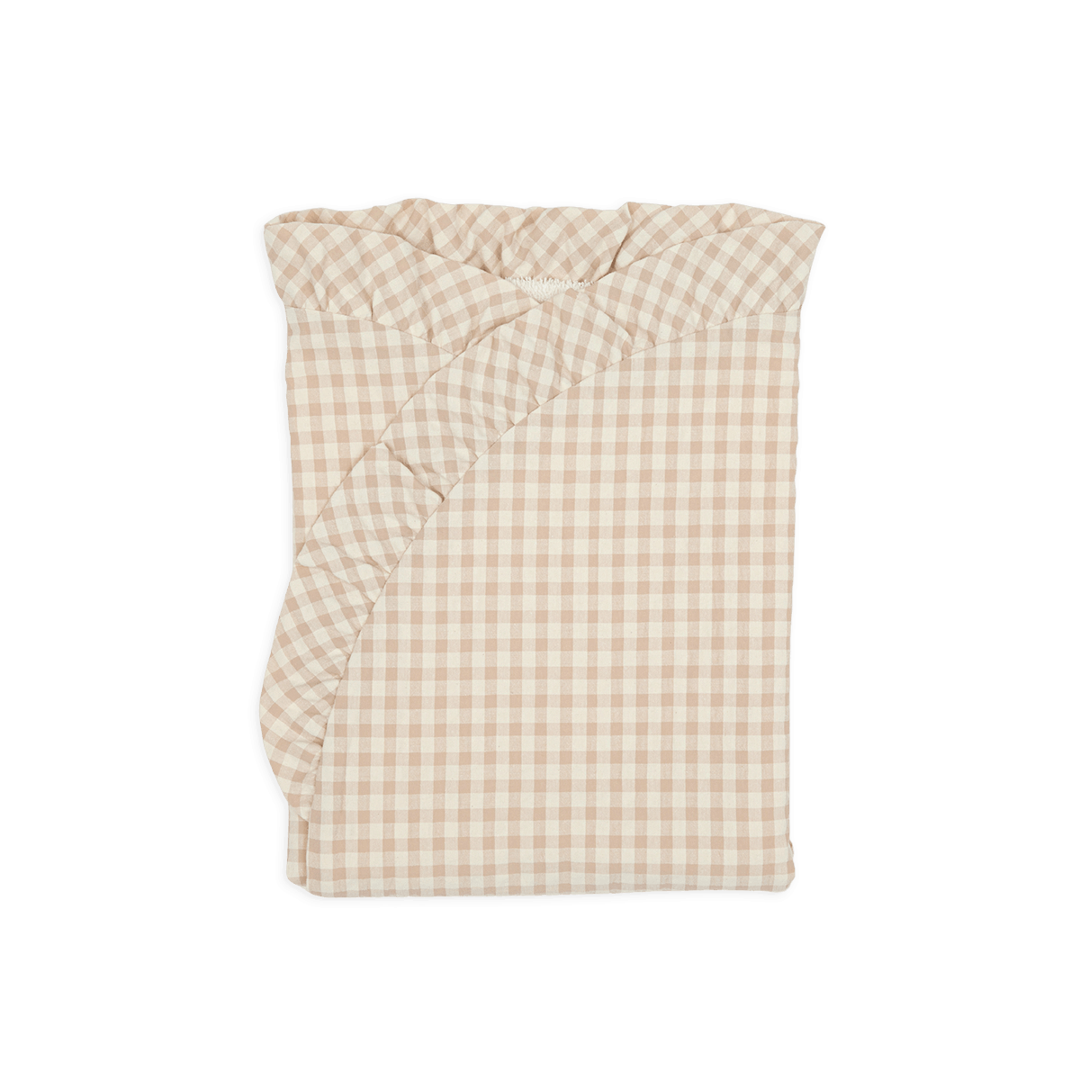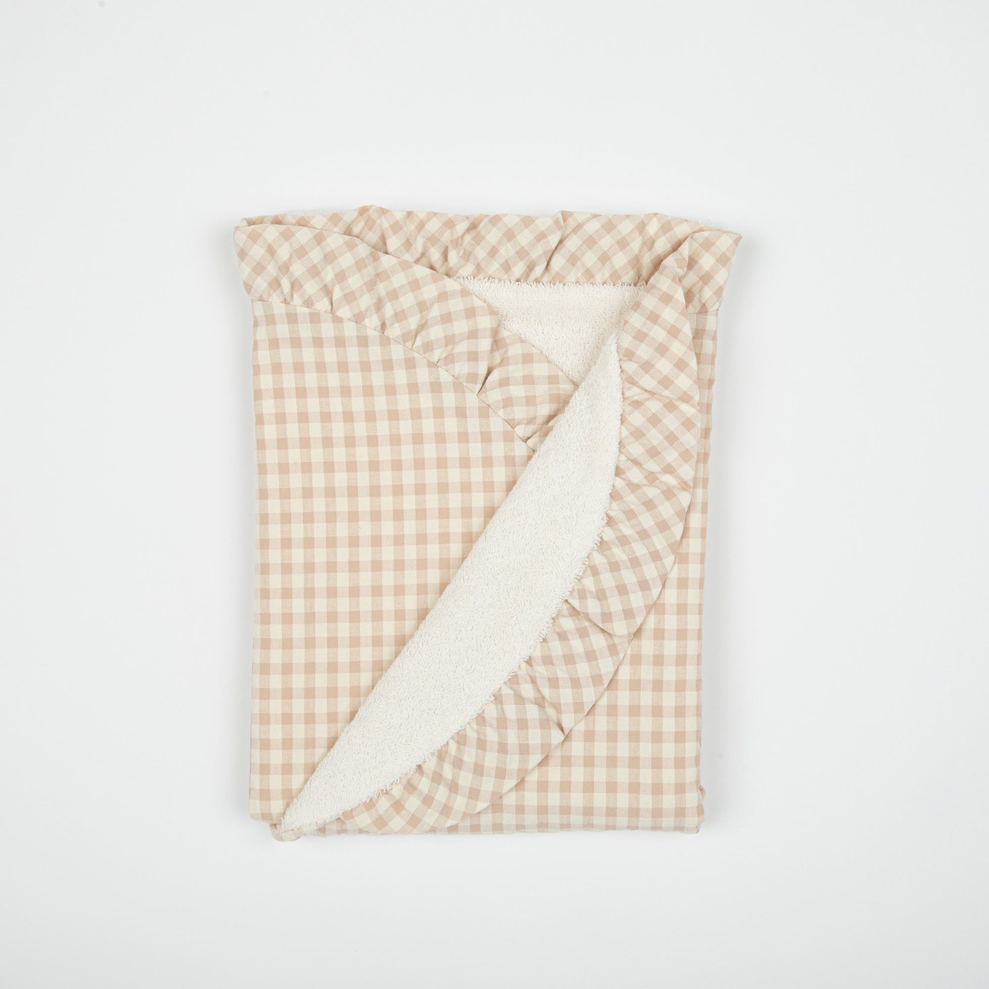 O nosso arrulho é de tecido vichy rosa e cru, com interior de suave toalha de rizo francês de alta absorção.
