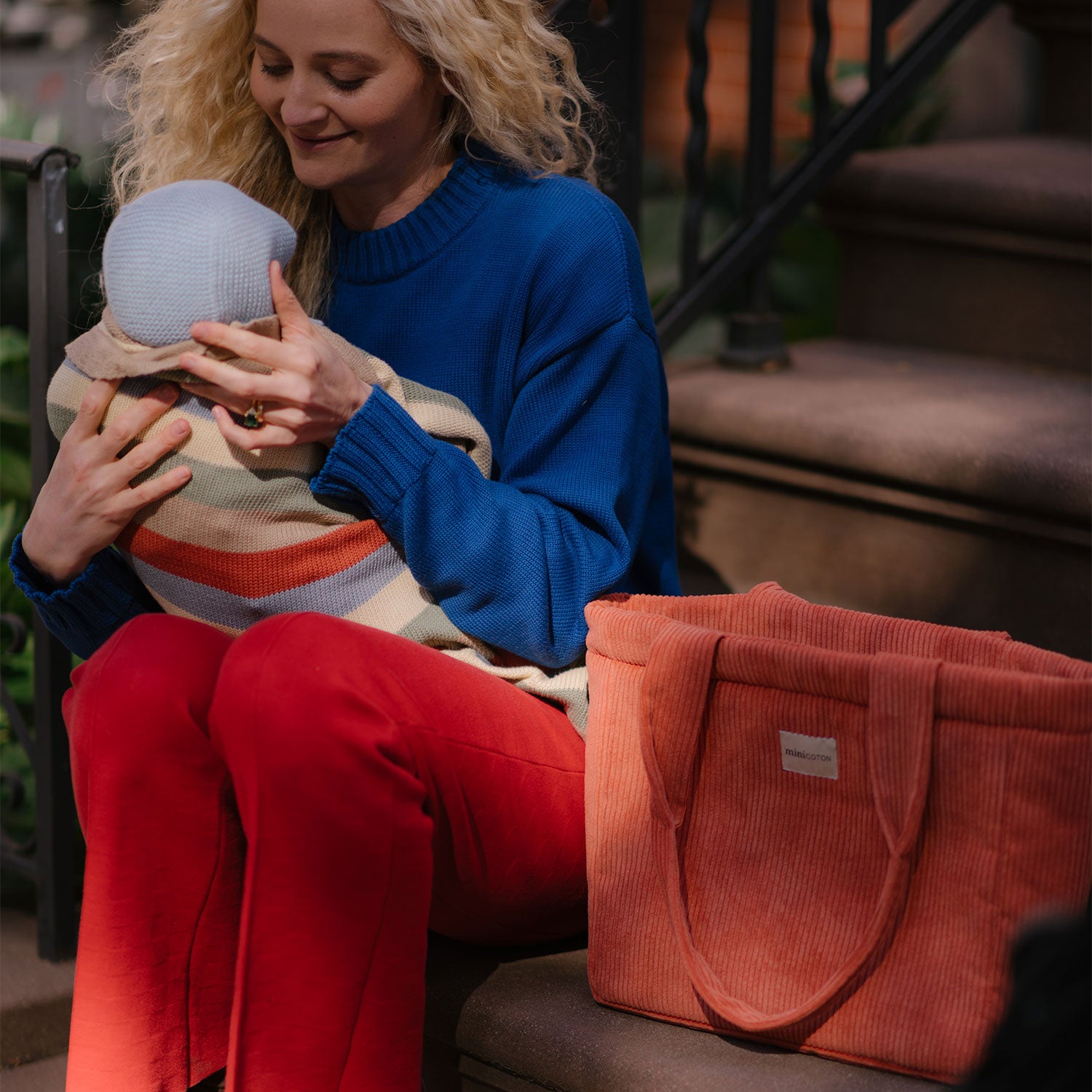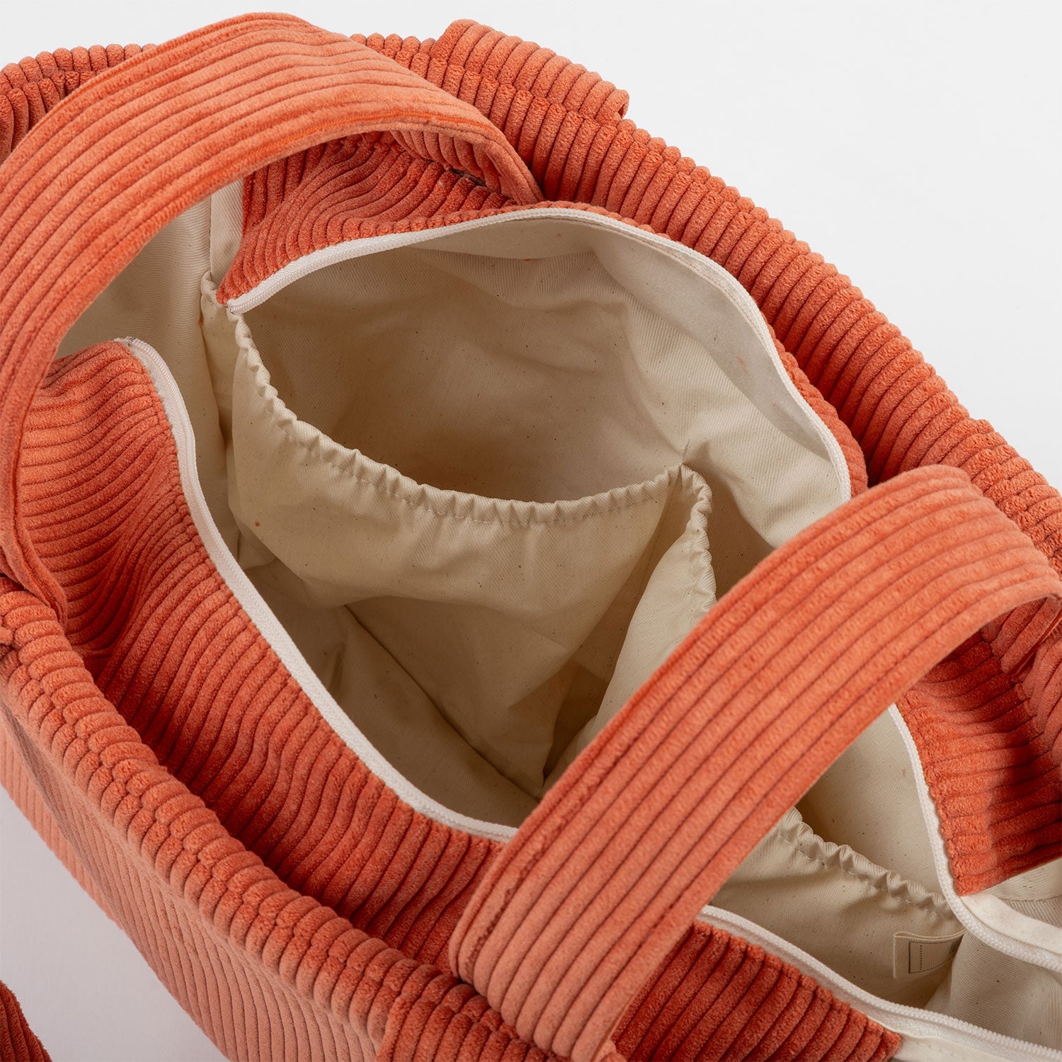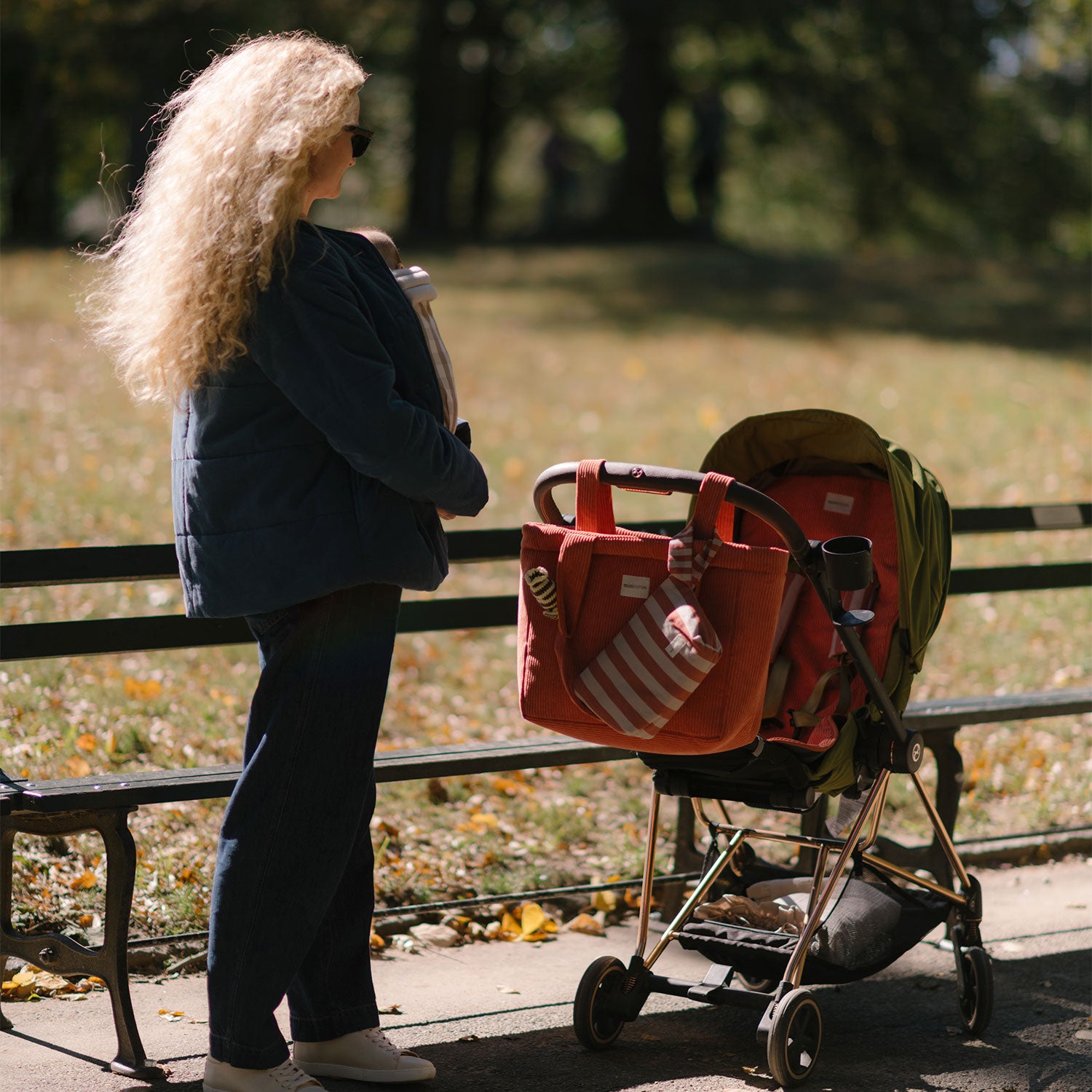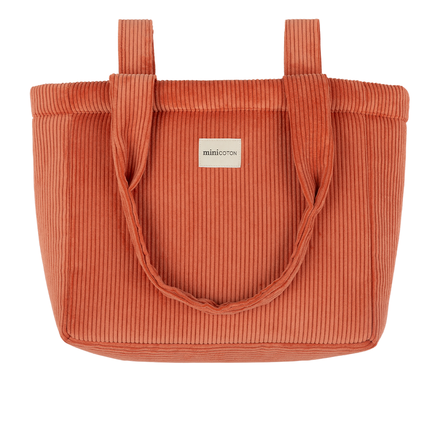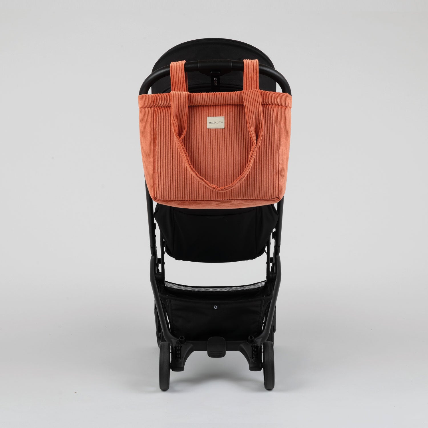 Uma bolsa espaçosa e muito leve. Com alças para o guiador do carrinho que se escondem através das suas ilhós, para se transformar num prático tote para levar ao ombro. Com dois bolsos interiores e fecho com zíper.