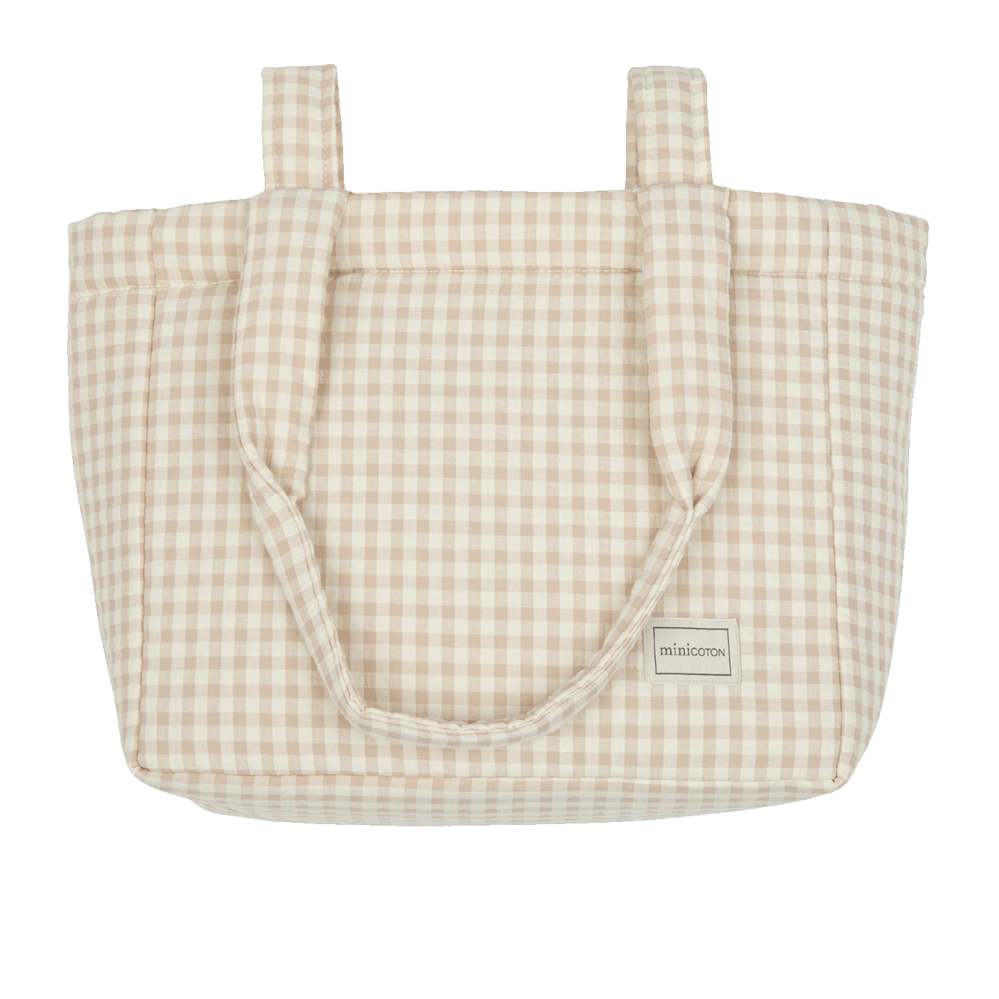 Uma bolsa espaçosa e muito leve. Com alças para o guiador do carrinho que se escondem através das suas ilhós, para se transformar numa prática tote para levar ao ombro. Com dois bolsos interiores e fecho com zíper.