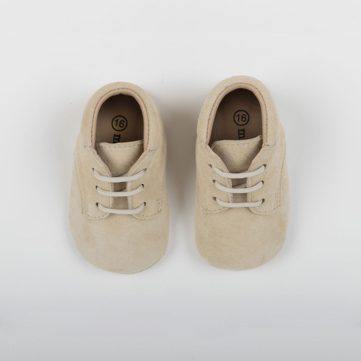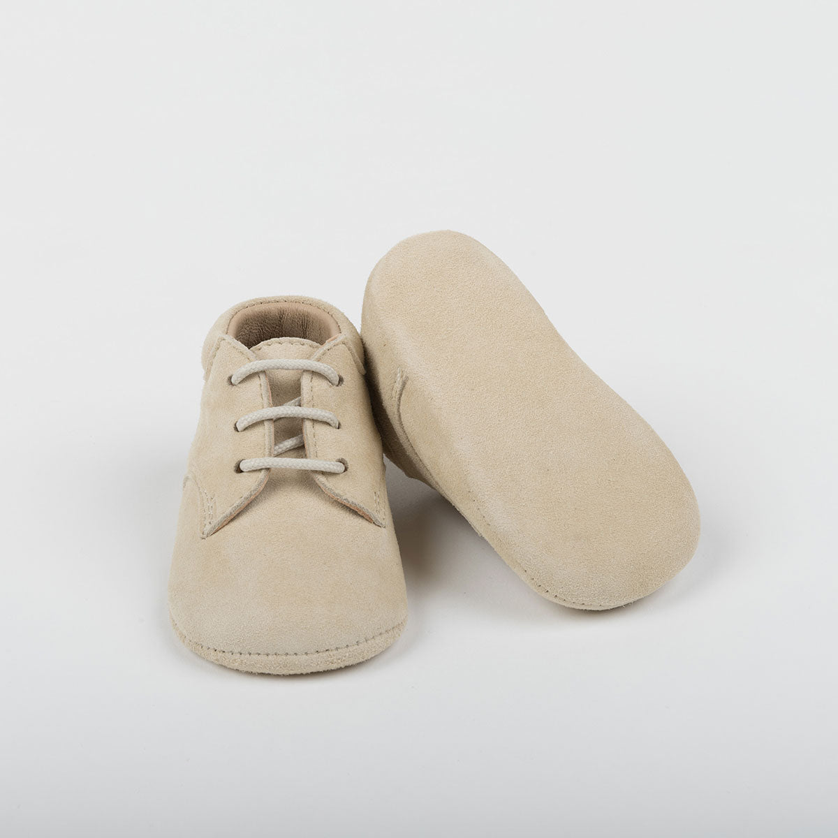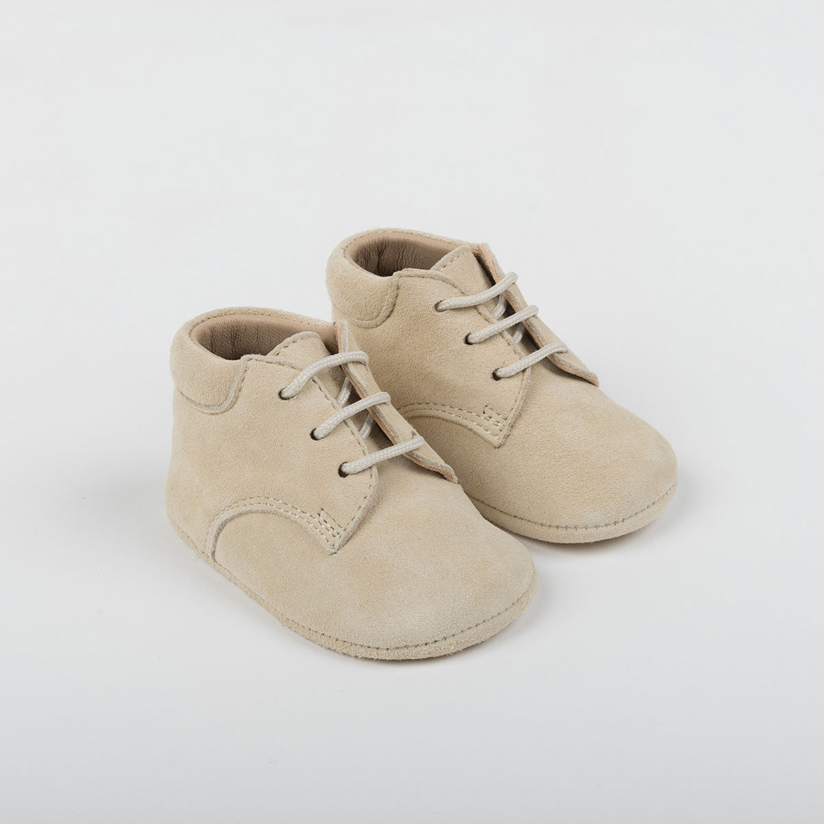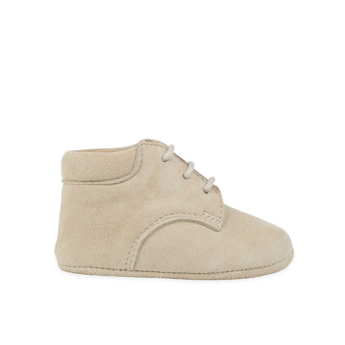 Bota de suave pele de camurça cor bege. Fecho com atacadores para maior fixação. Palmilha acolchoada e sola flexível de pele 100%. Pela sua flexibilidade e suavidade, é respeitosa com os pés e muito confortável, tornando-se numa segunda pele.
