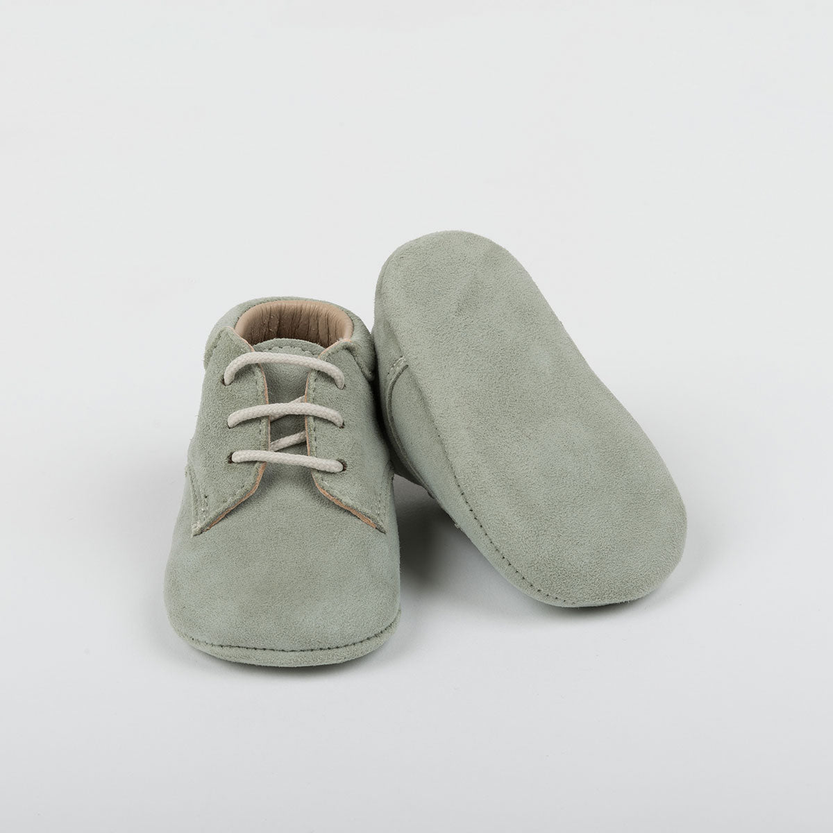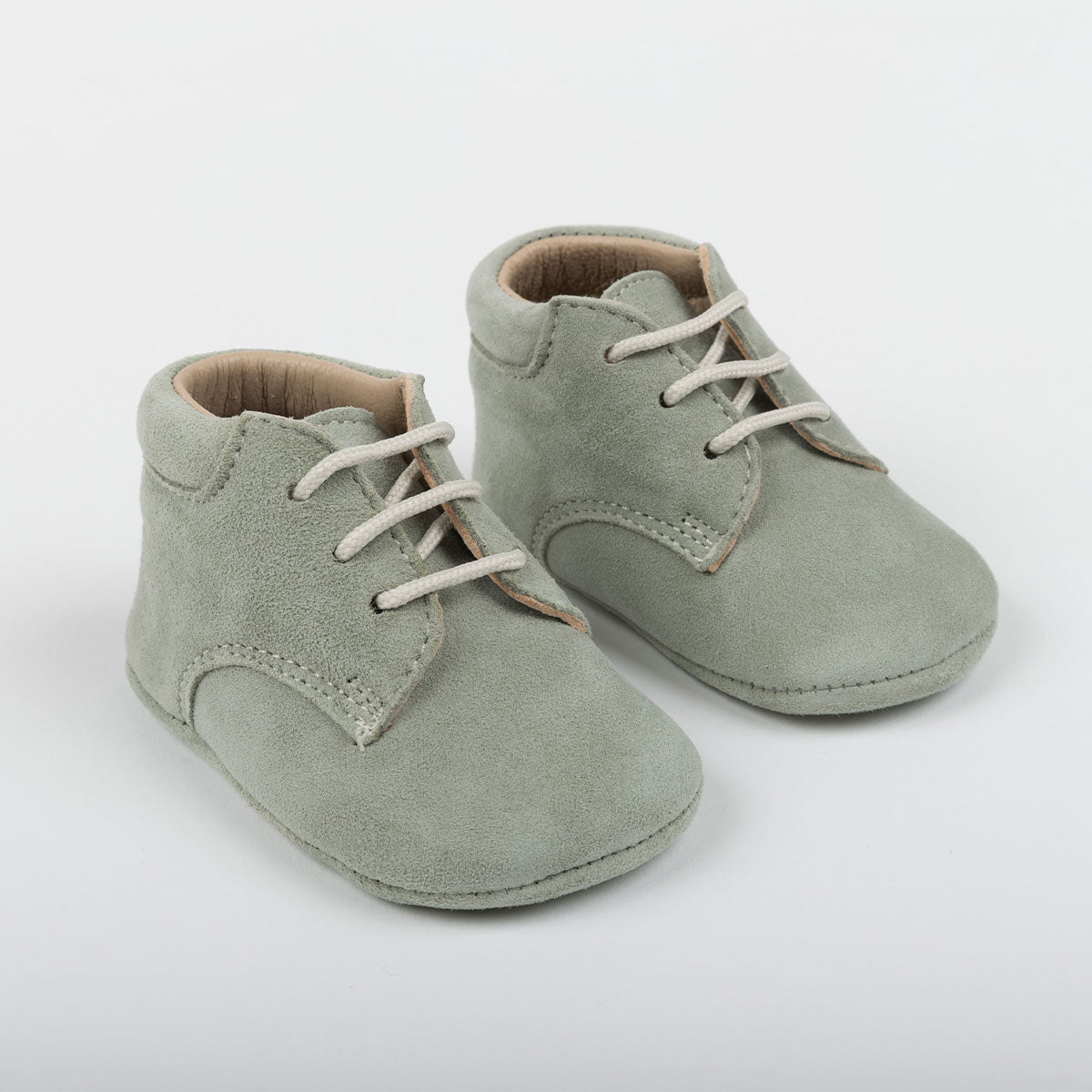Bota de suave pele de camurça verde. Fecho com atacadores para maior fixação. Palmilha acolchoada e sola flexível de pele 100%. Pela sua flexibilidade e suavidade, é respeitadora dos pés e muito confortável, tornando-se numa segunda pele.