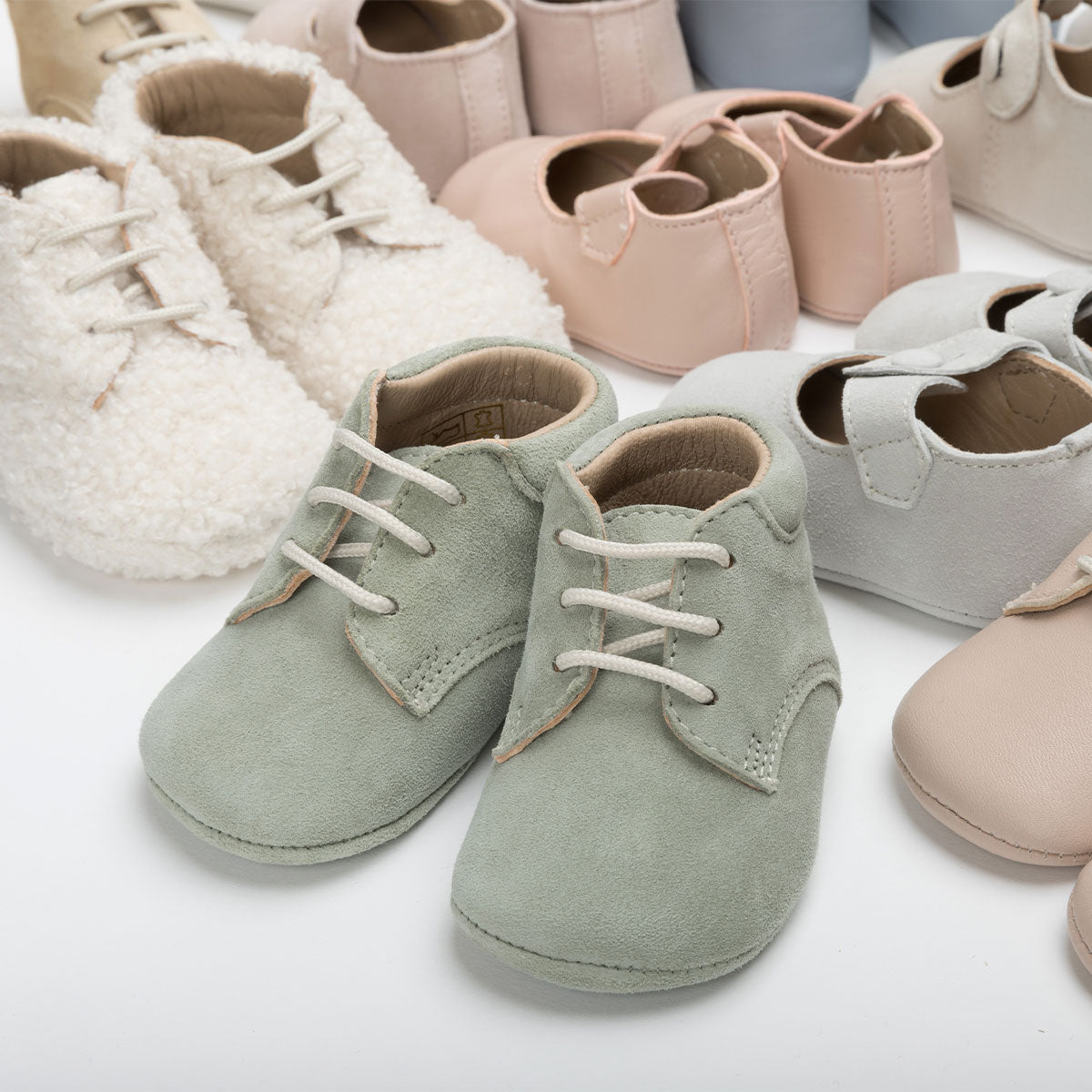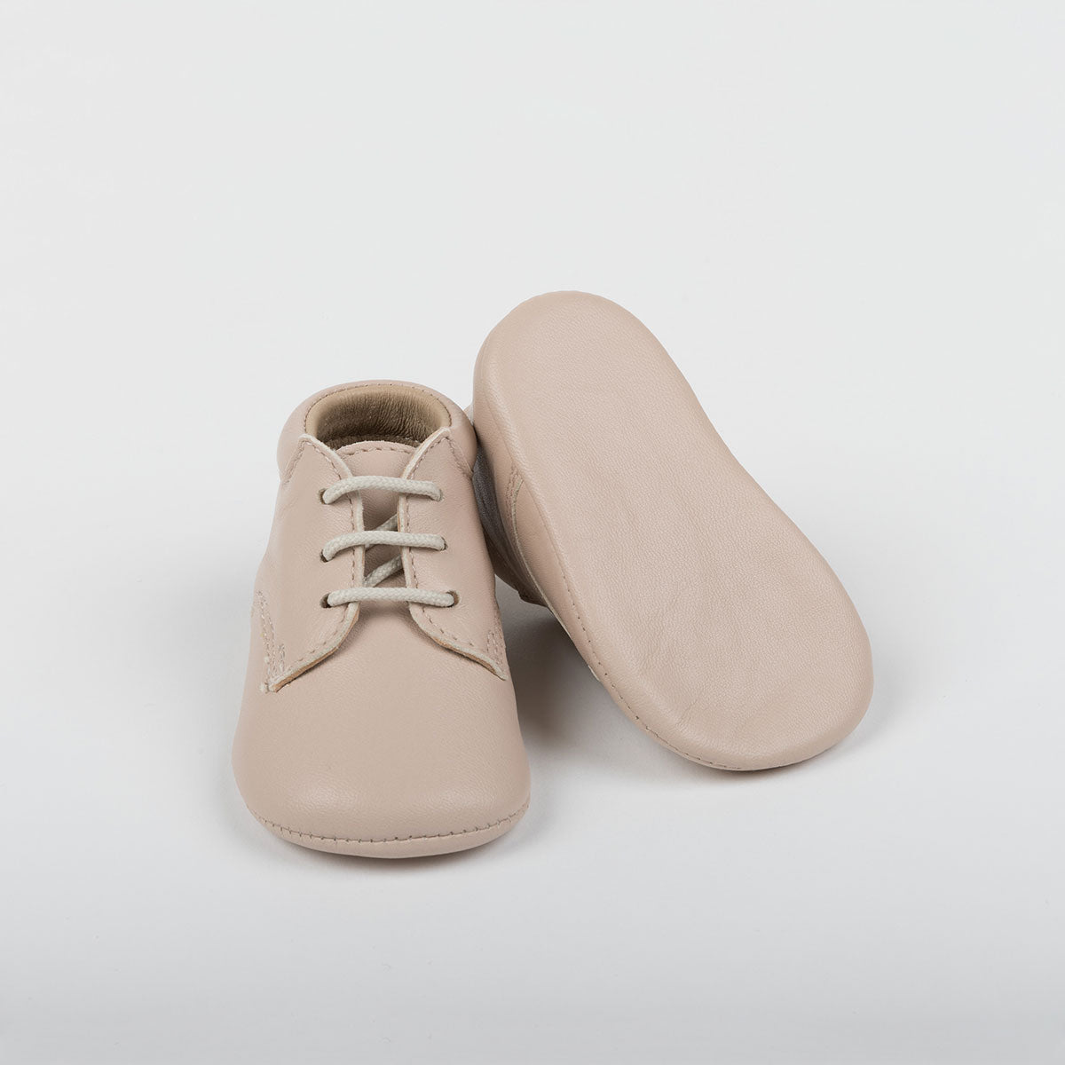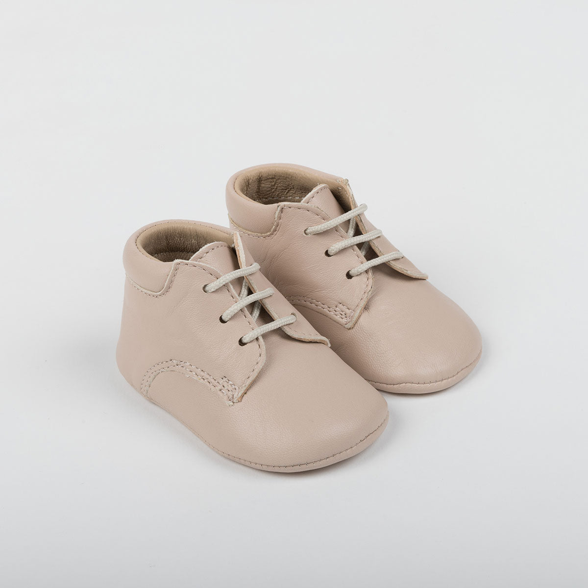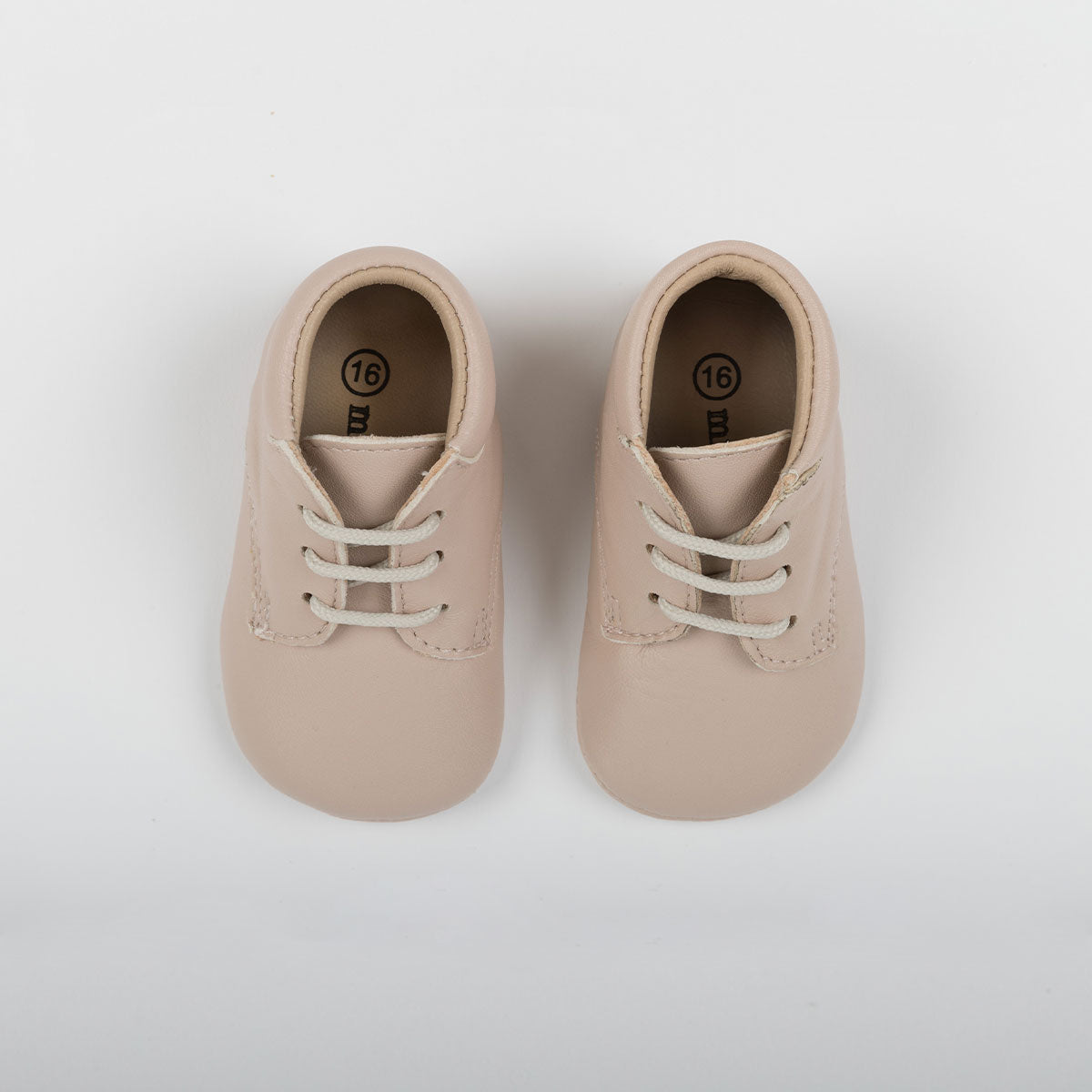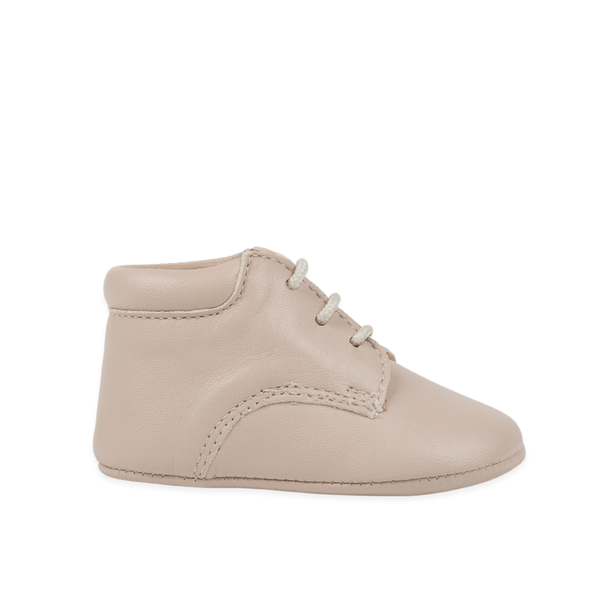 Bota de suave pele de napa cor de rosa esbatida. Fecho com atacadores para maior fixação. Palmilha acolchoada e sola flexível de pele 100%. Pela sua flexibilidade e suavidade, é respeitosa com os pés e muito confortável, tornando-se numa segunda pele.