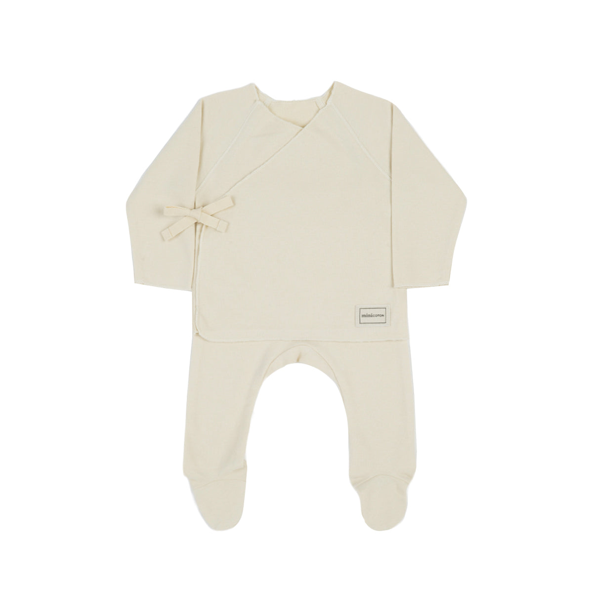 Primeira muda, um essencial na mala da clínica. Conjunto composto por camisola cruzada e polaina. Confeccionado em malha de algodão extra suave. Também pode encontrar o gorro a condizer.