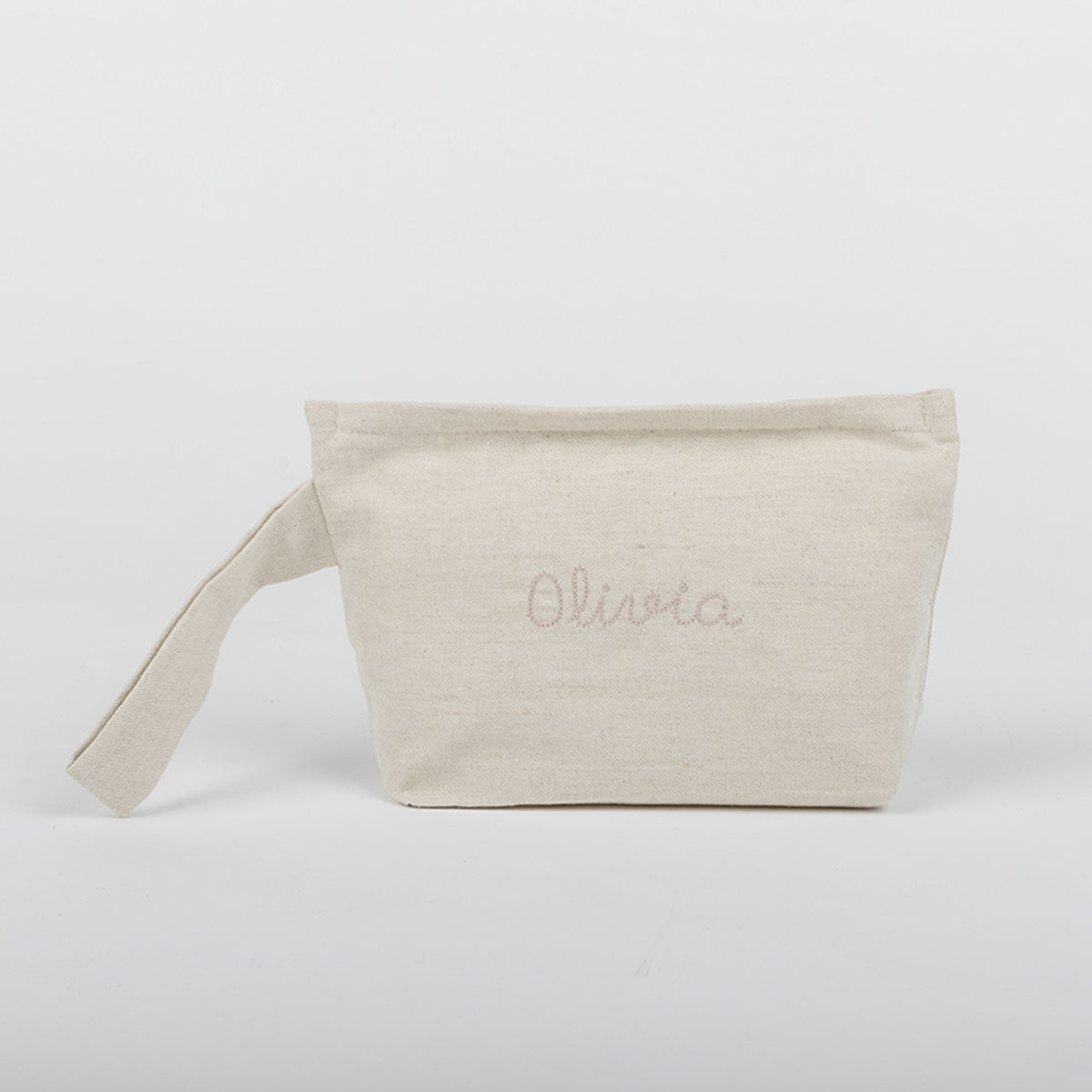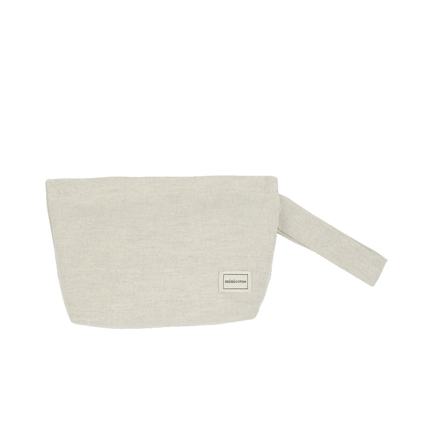 É muito prática porque tem uma alça para poder colocar a bolsa no pulso, e assim ter as mãos livres para cuidar do nosso bebé. 44% linho 56% algodão.