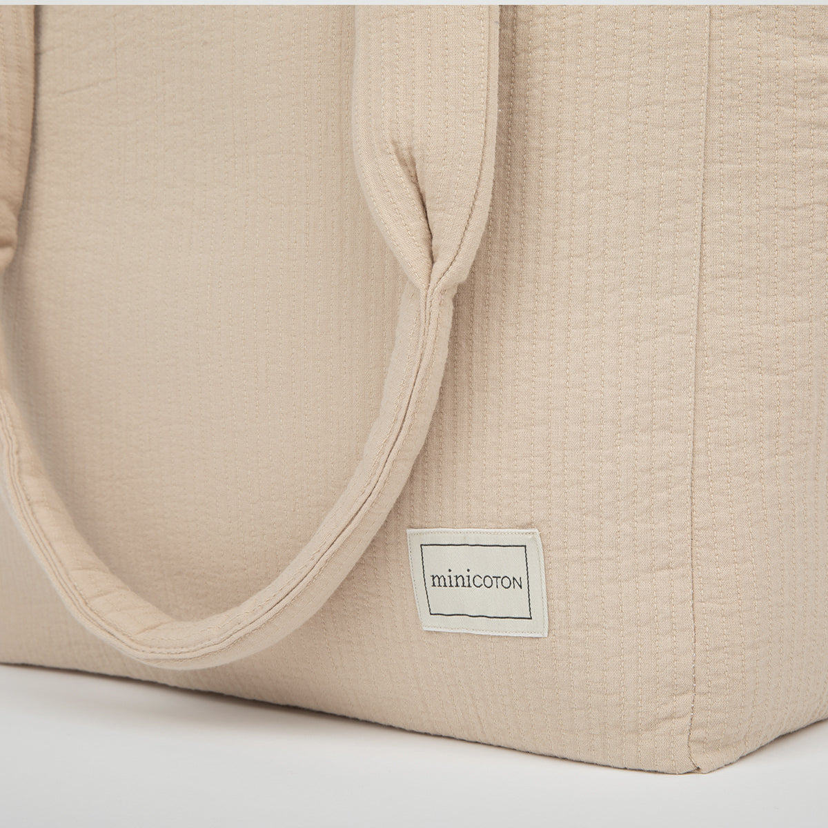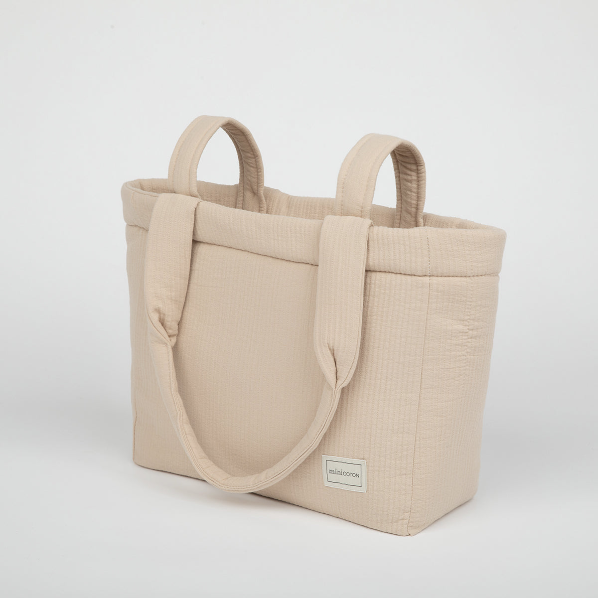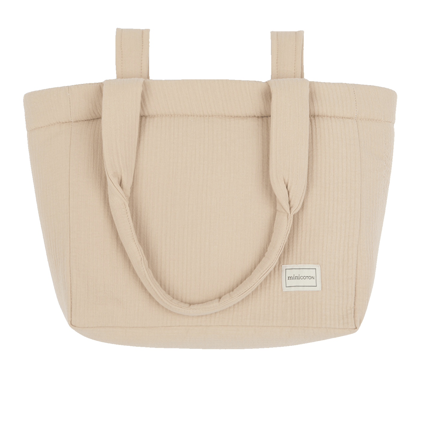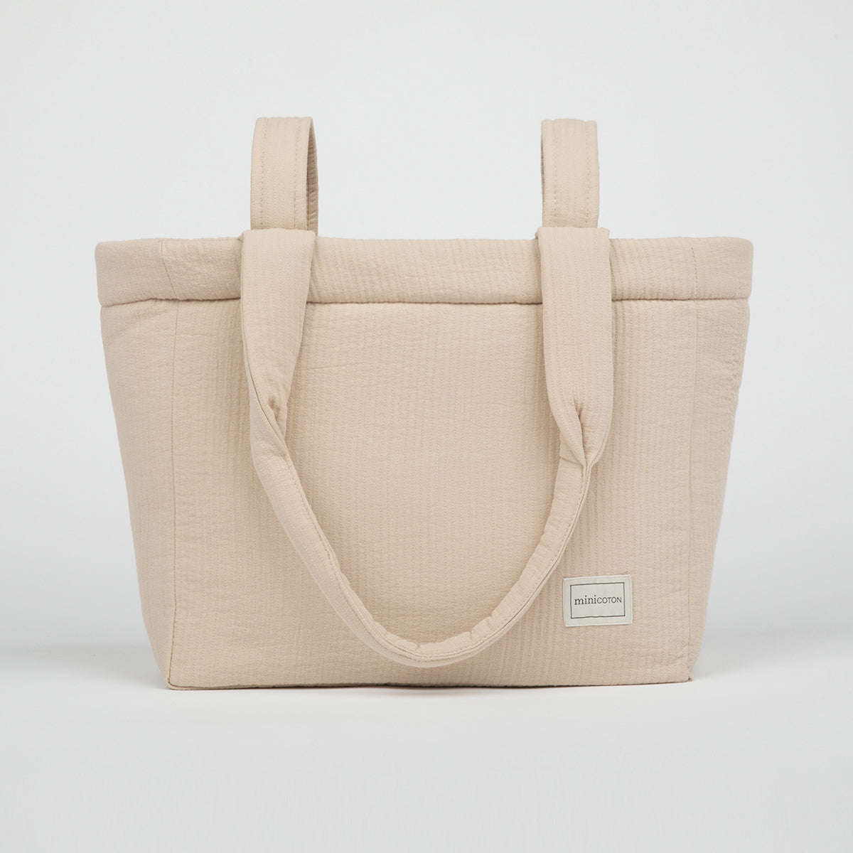 Uma bolsa espaçosa e muito leve. Com alças para o guiador do carrinho que se escondem através das suas ilhós, para se transformar numa prática tote para levar ao ombro. Com dois bolsos interiores e fecho com zíper.