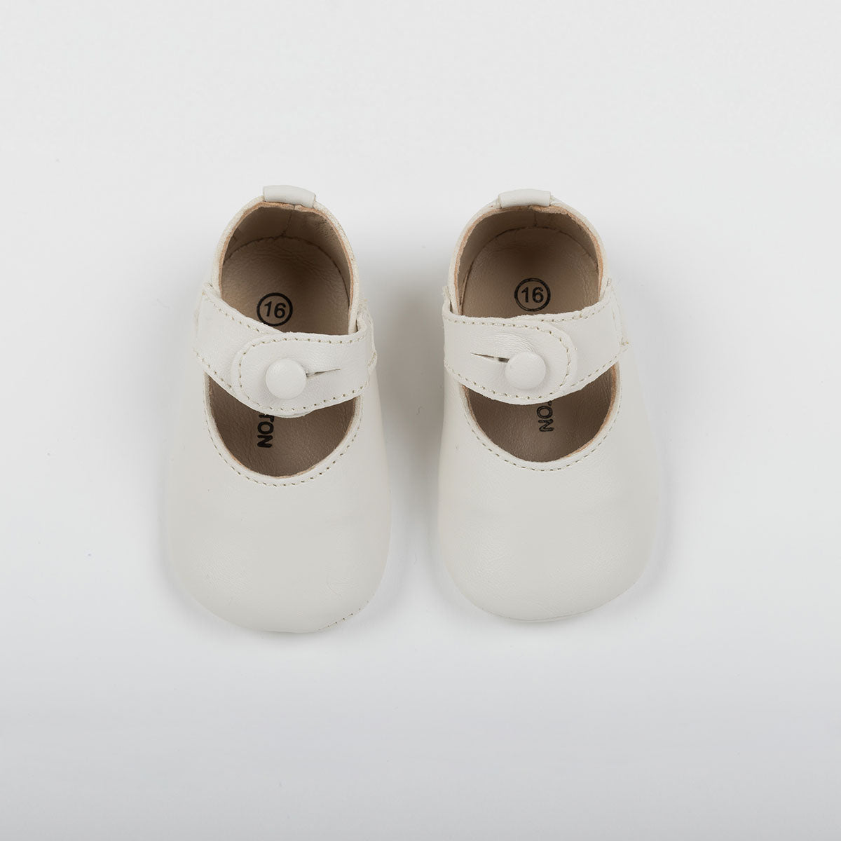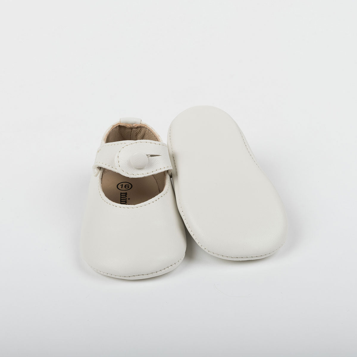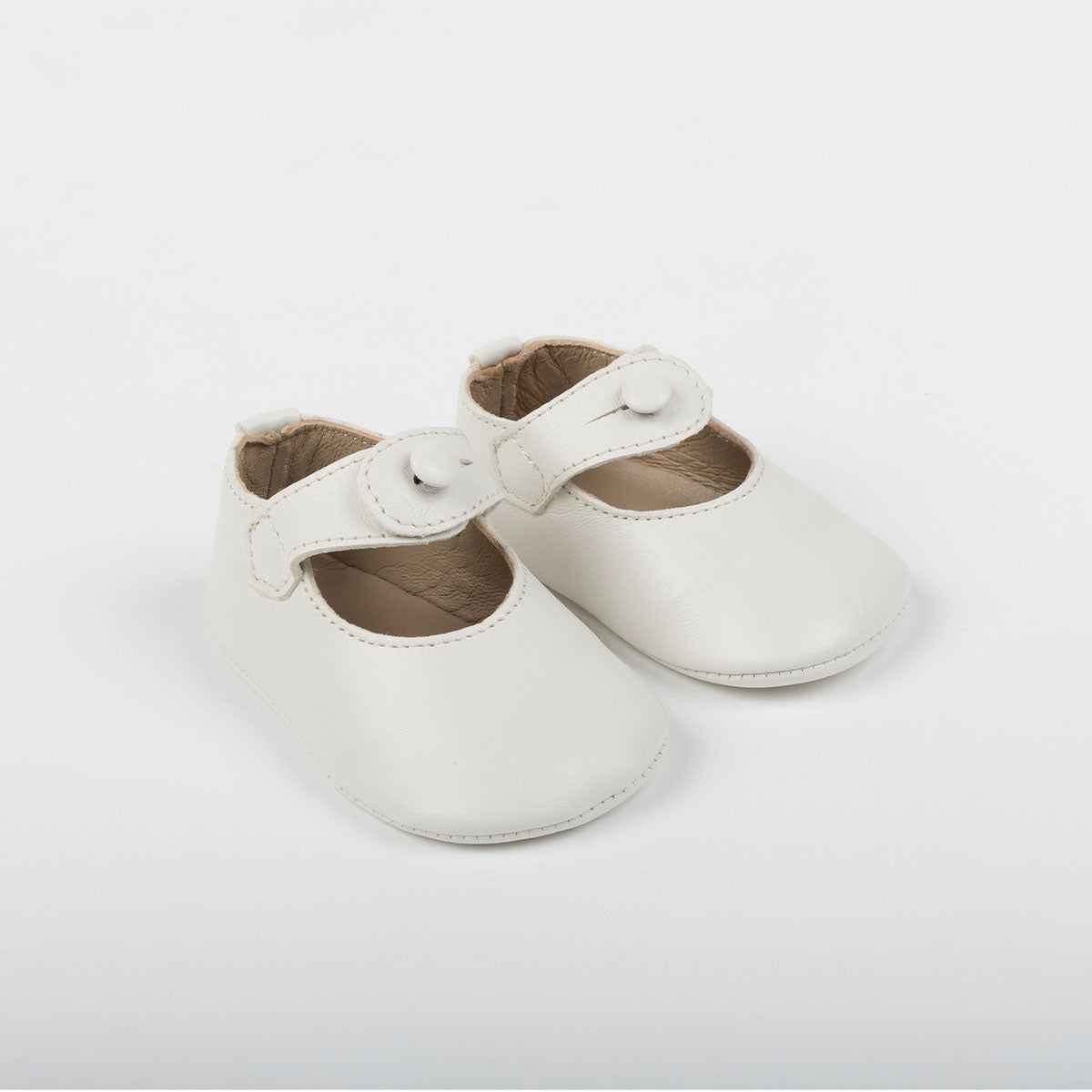 Bailarina de suave pele de napa de cor branco osso. Fecho com botão para maior conforto. Palmilha acolchoada e sola flexível de pele 100%. Pela sua flexibilidade e suavidade, é respeitadora dos pés e muito confortável, tornando-se numa segunda pele.