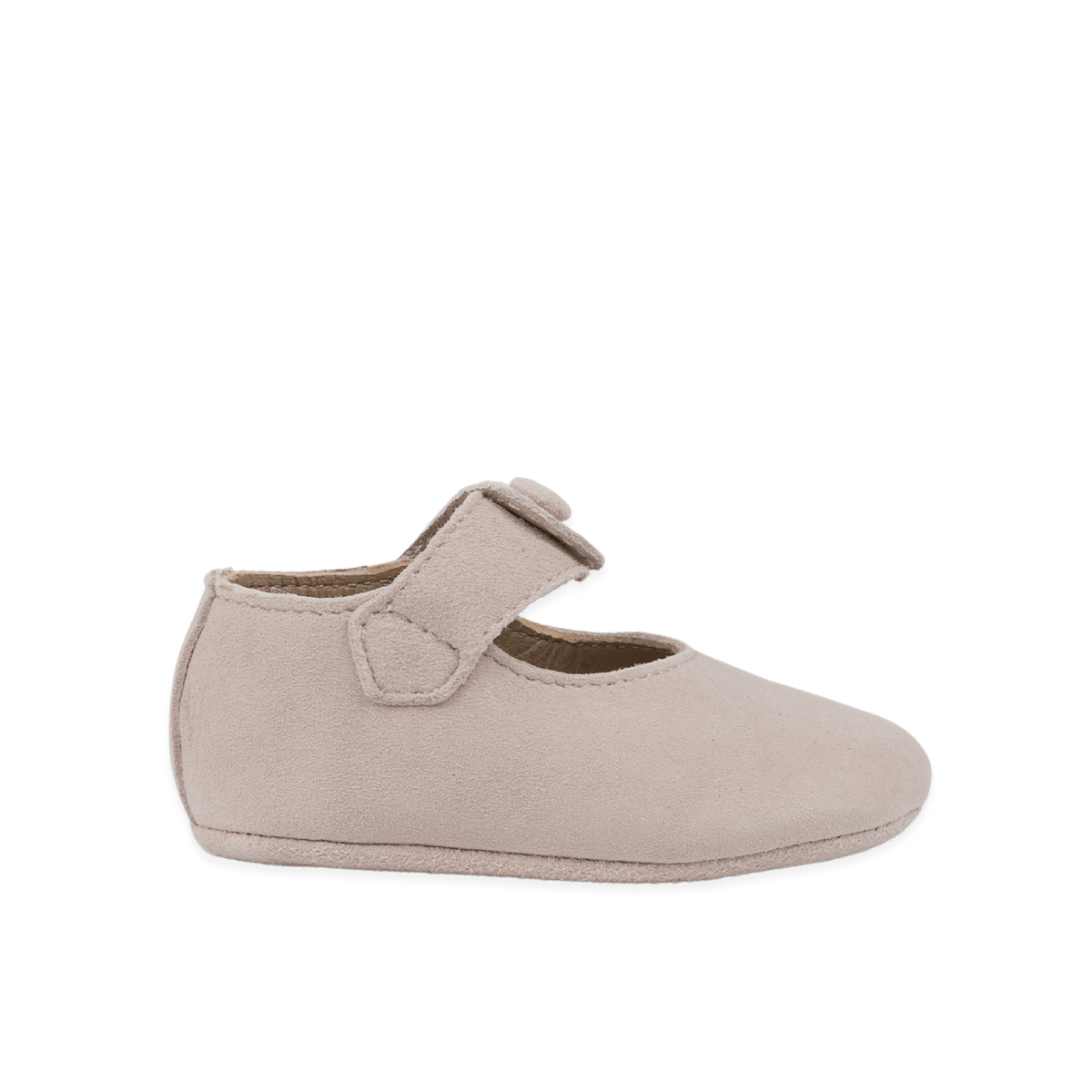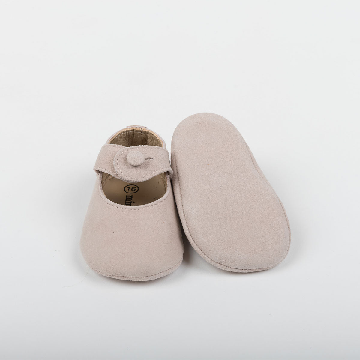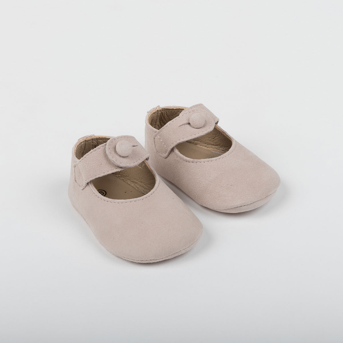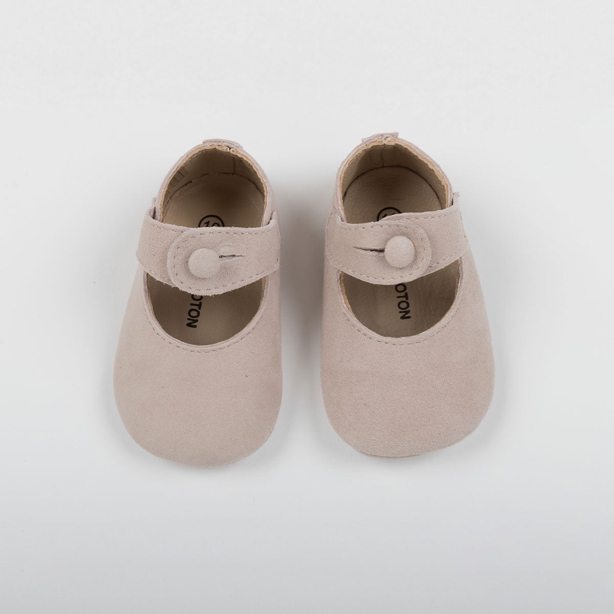 Bailarina de suave pele de camurça cor de rosa empoada. Fecho com botão para maior conforto. Palmilha acolchoada e sola flexível de pele 100%. Pela sua flexibilidade e suavidade, é respeitosa para com os pés e muito confortável, tornando-se numa segunda pele.