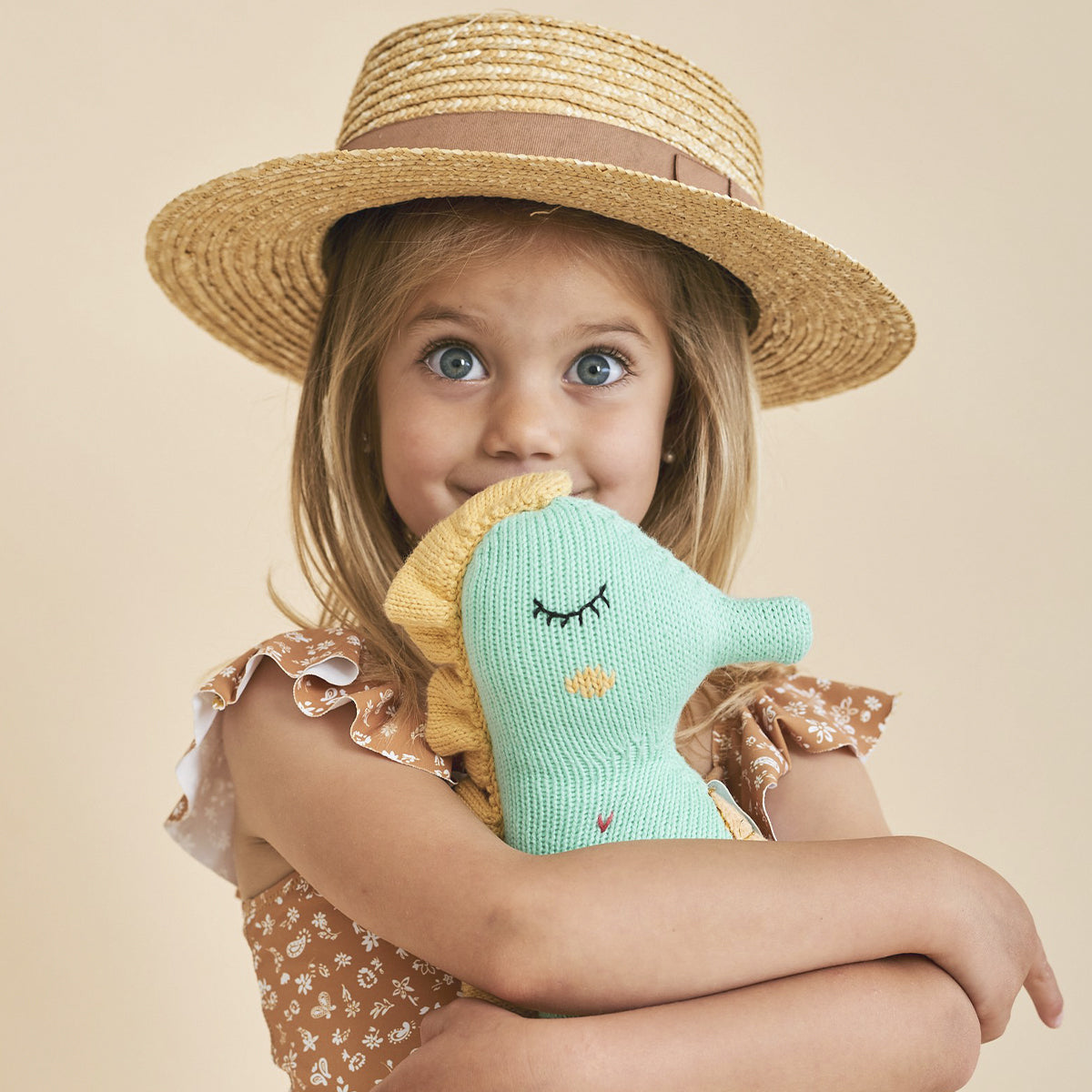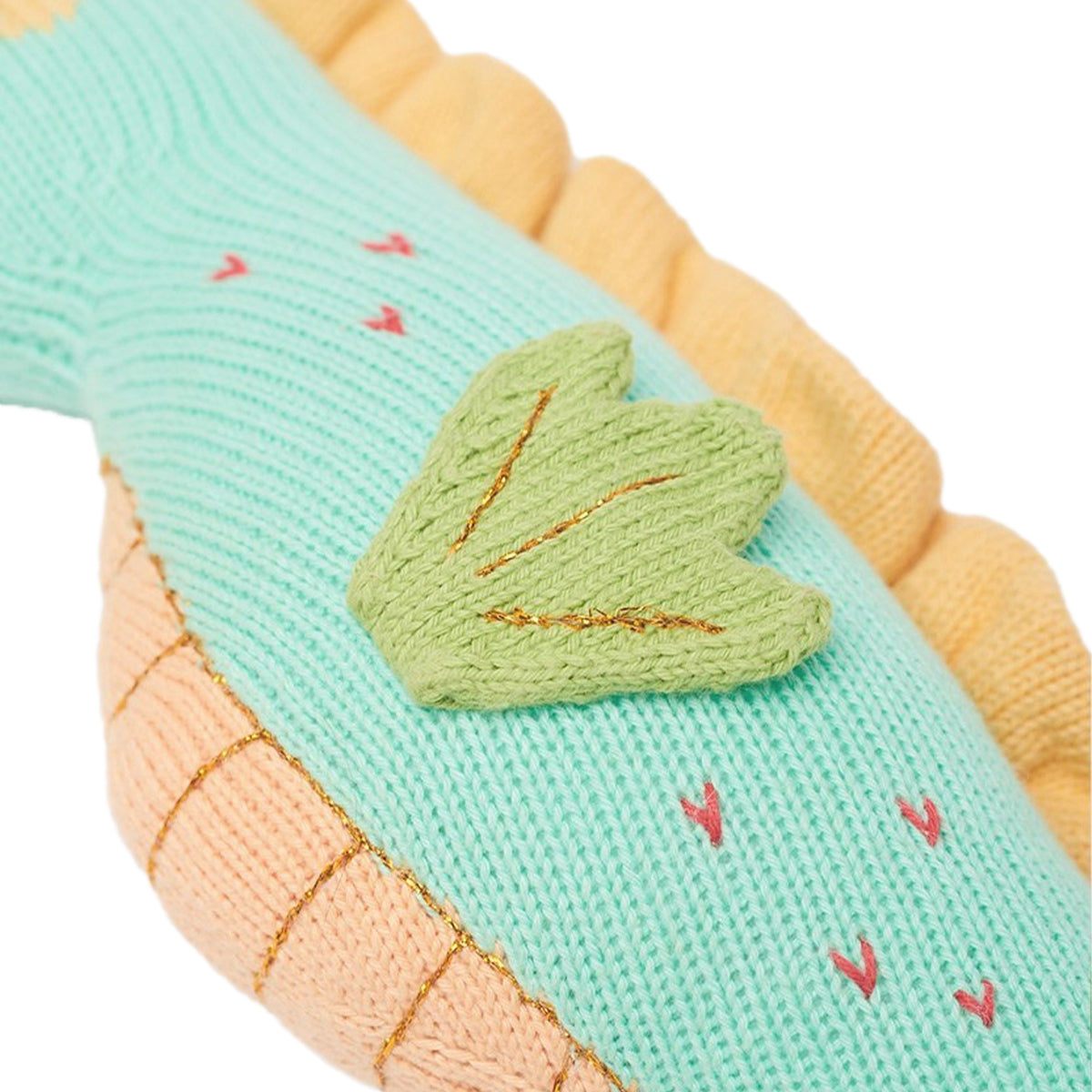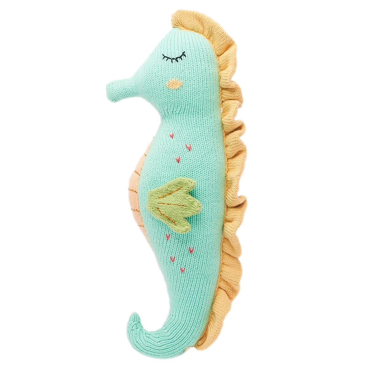 Minty. O cavalo-marinho feito peluche artesanalmente com 100% algodão PIMA orgânico, certificado Oeko-Tex 100 e enchimento em poliéster reciclado hipoalergénico. Tintas ecológicas não tóxicas. Adequado para peles sensíveis.