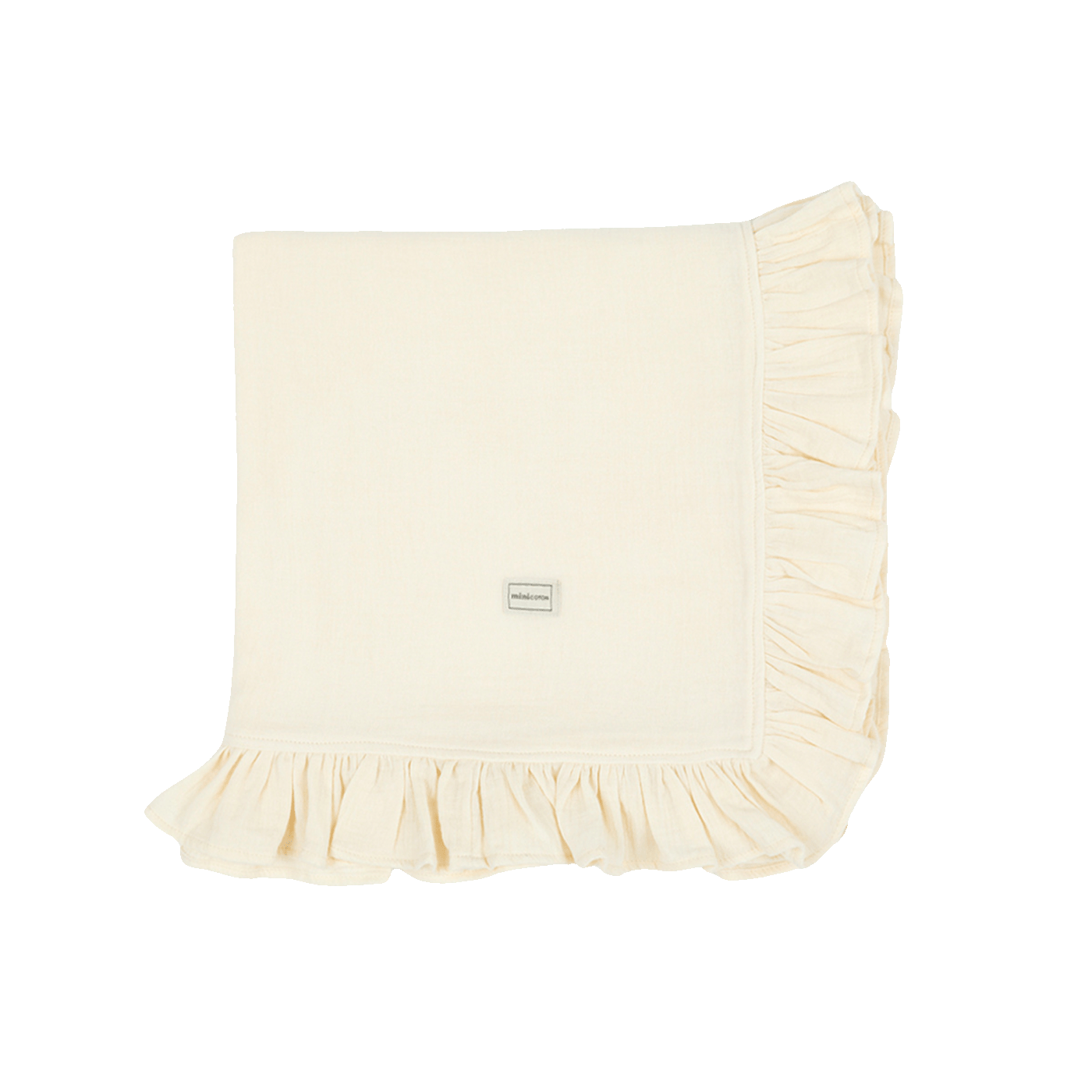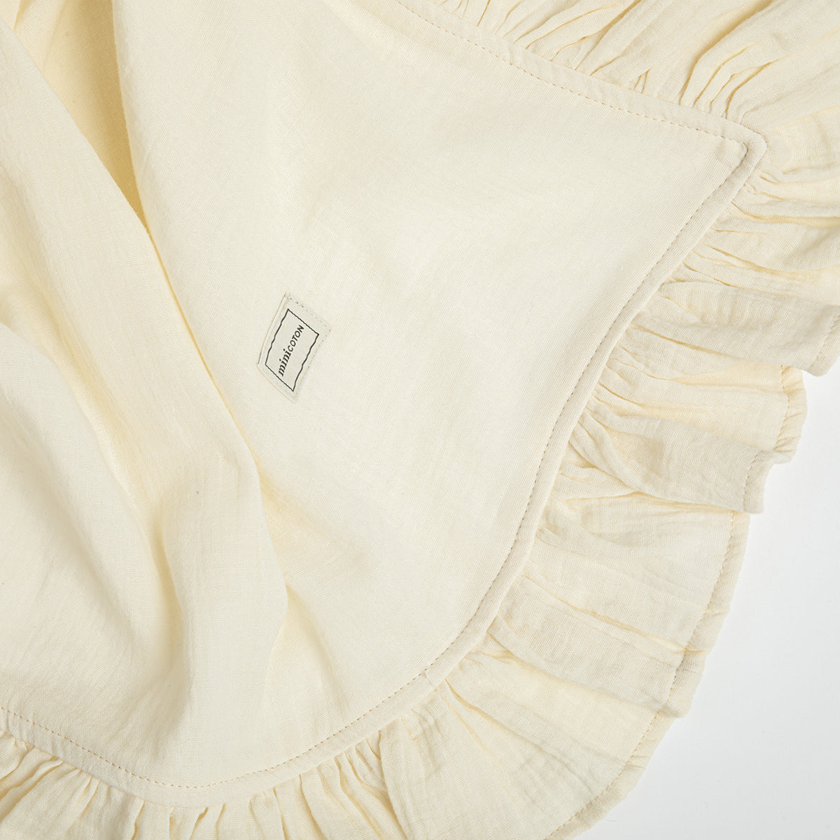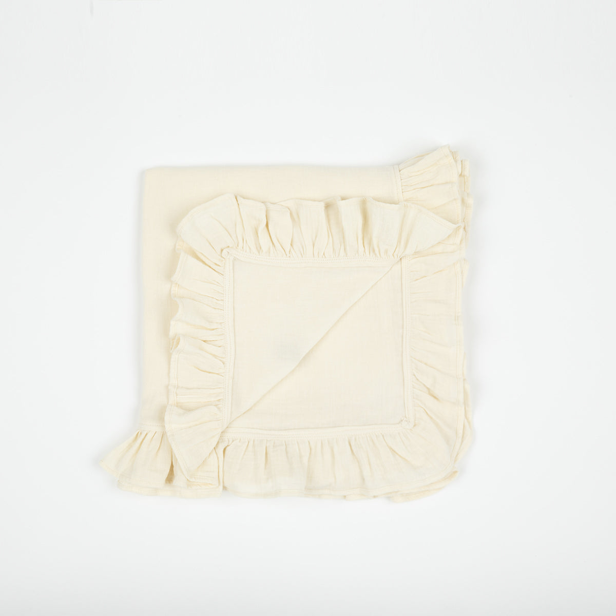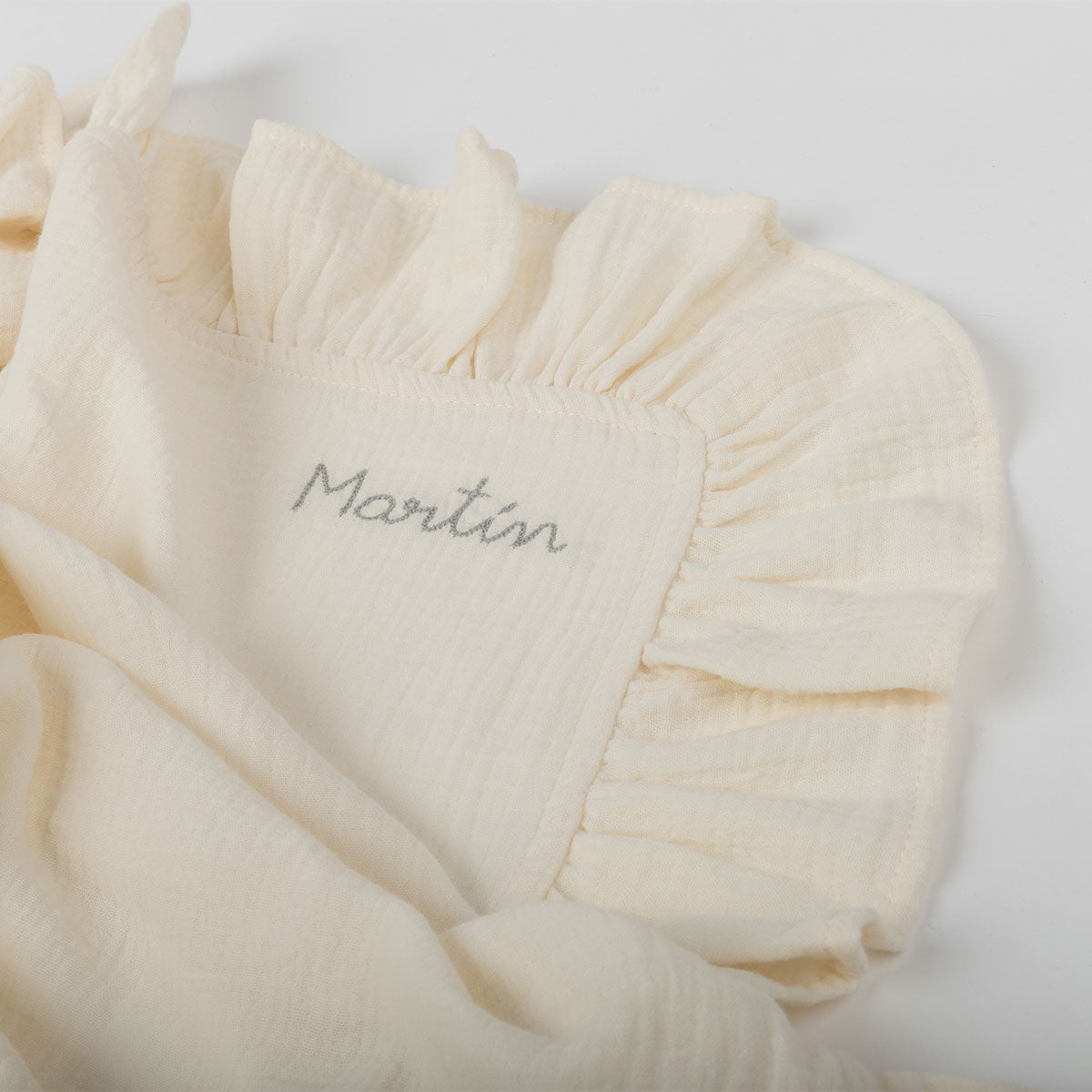 As muselinas são um essencial no enxoval do bebé, são multiusos e muito práticas pela sua respirabilidade e grande poder de absorção. Com folho à volta.