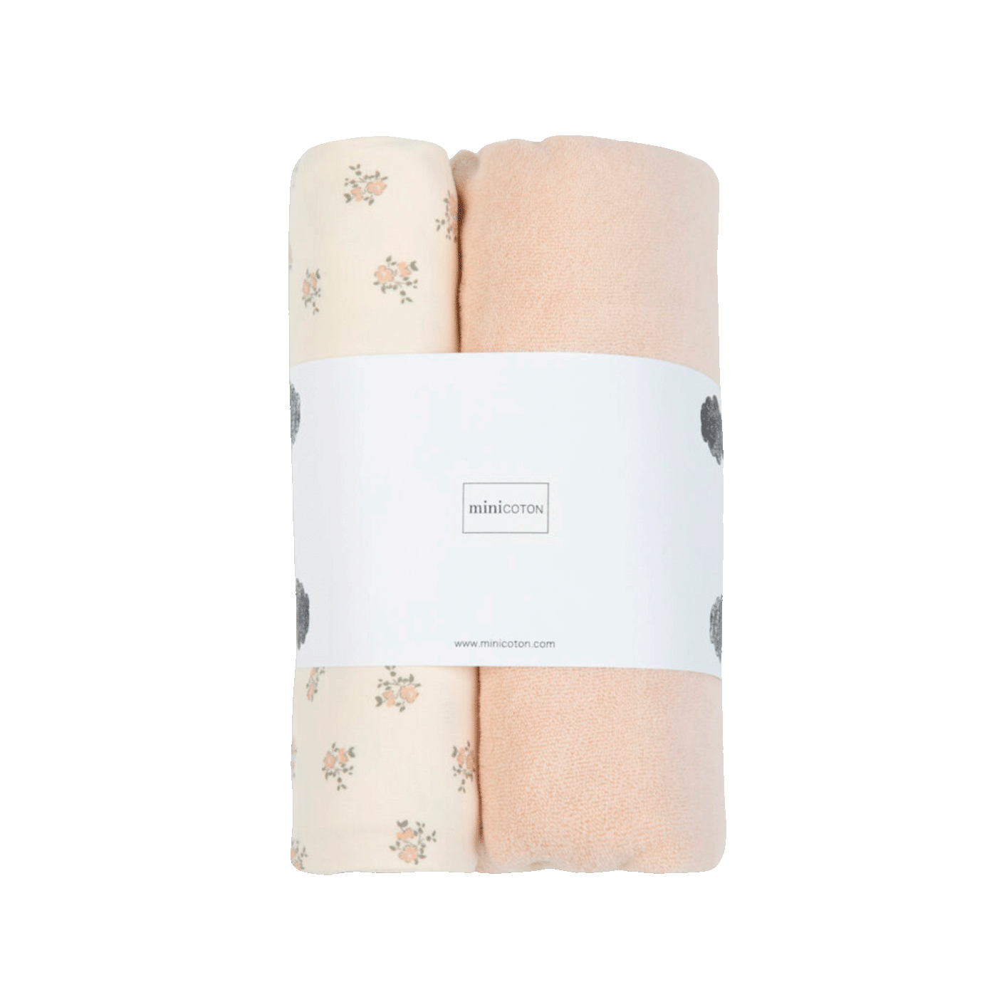 Pack de 2 capas para muda: uma em malha de algodão com textura de rizo petal e outra com estampado Blossom Rose de toque pele de pêssego.
