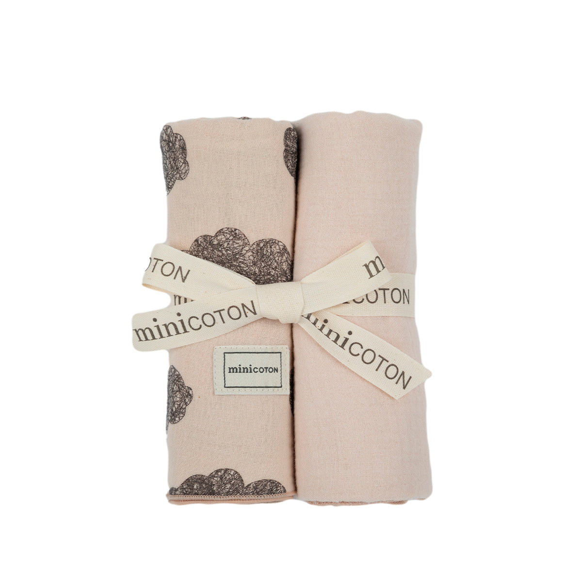Pack de muselinas Minicoton de algodão orgânico, uma em cor petal e a outra fundo petal com estampado de nuvens.