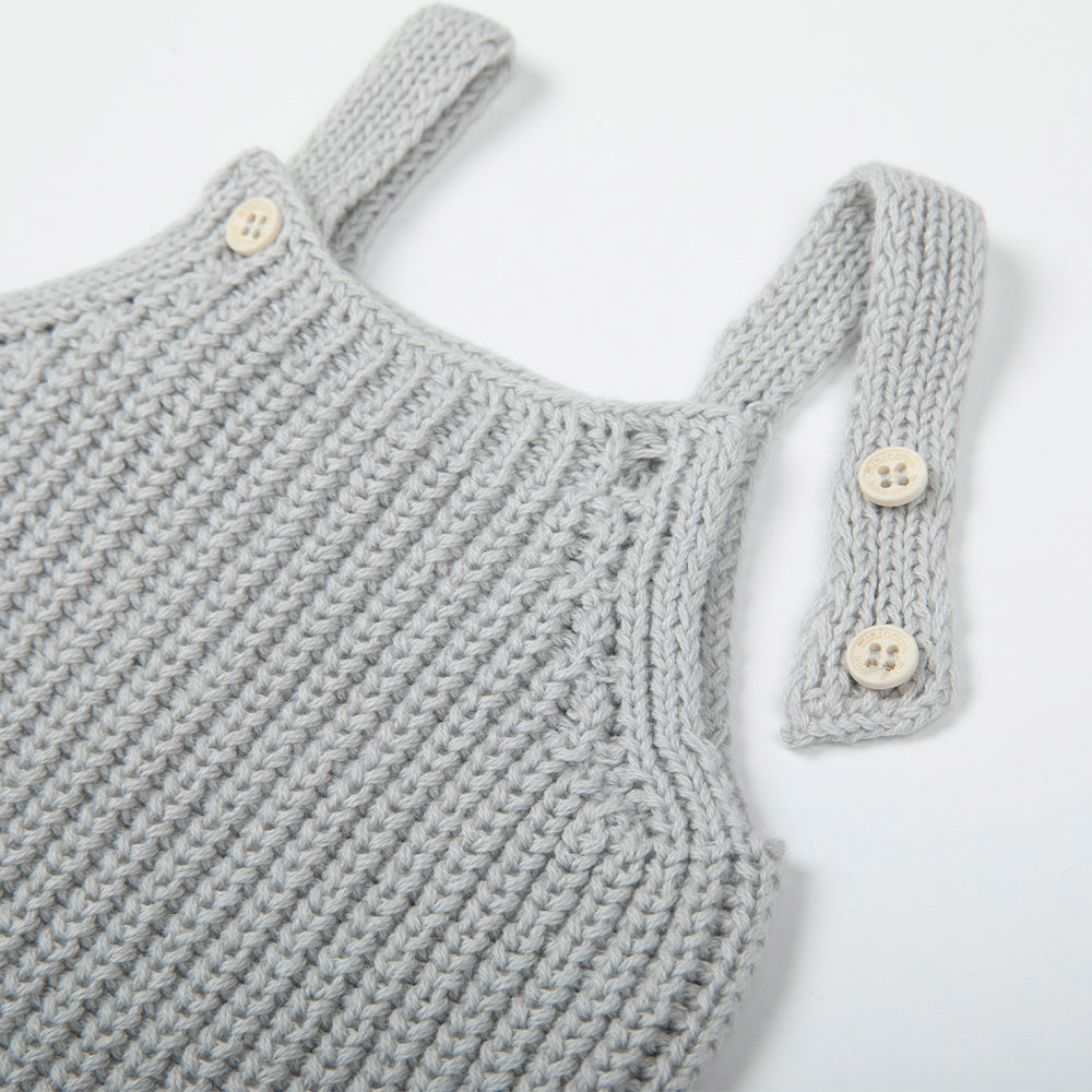 O nosso macacão em malha. Abotoa-se com botões sustentáveis, pois são fabricados com algodão, com duas posições para ajustar ao tamanho.