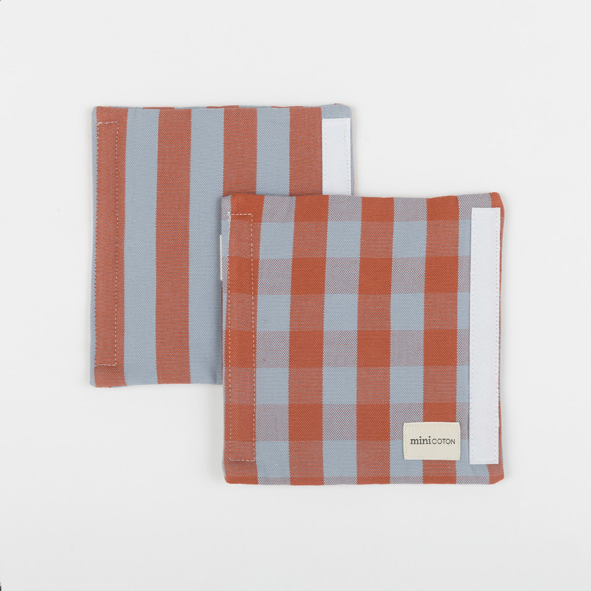 Reversíveis, de um lado às riscas e do outro em vichy de algodão 100%.