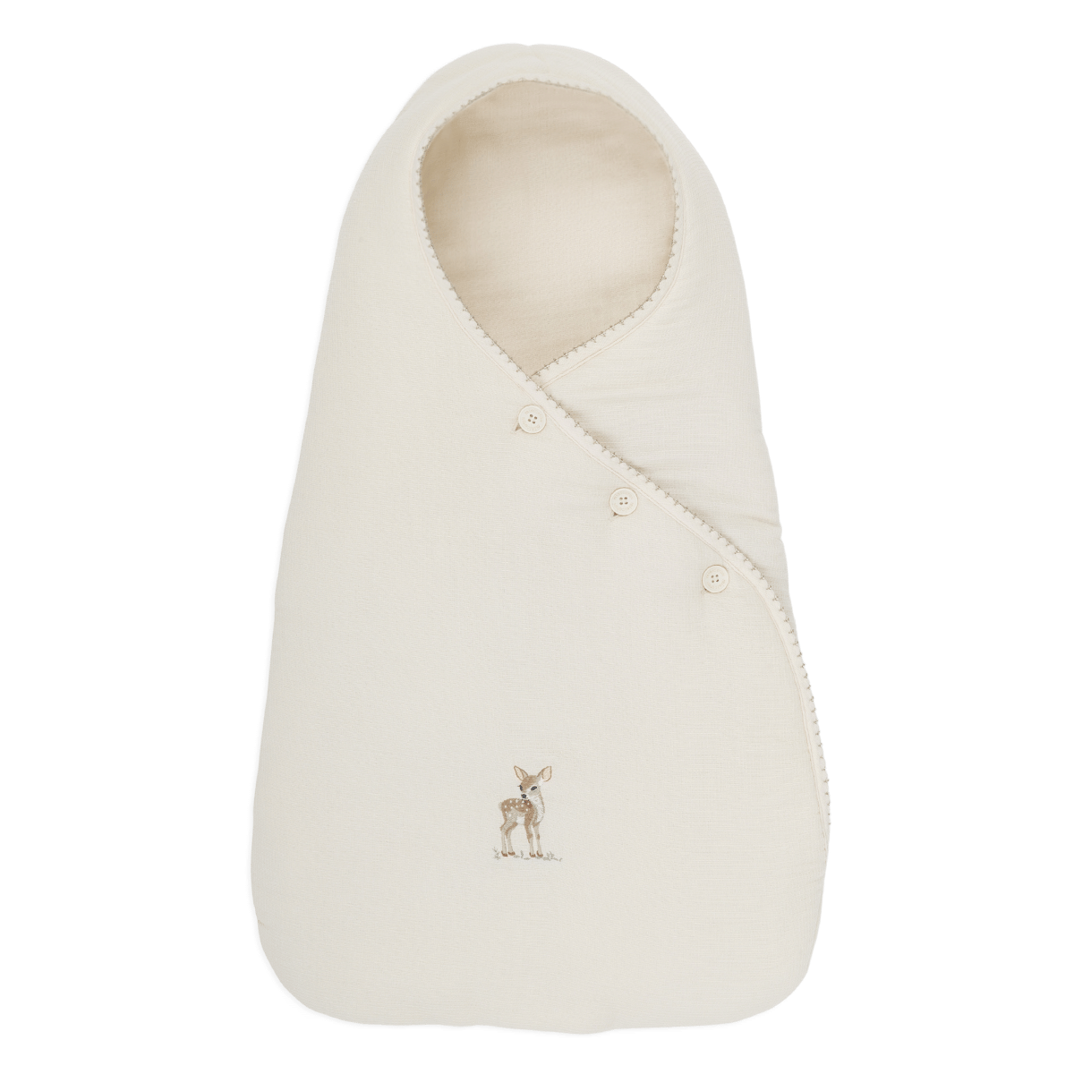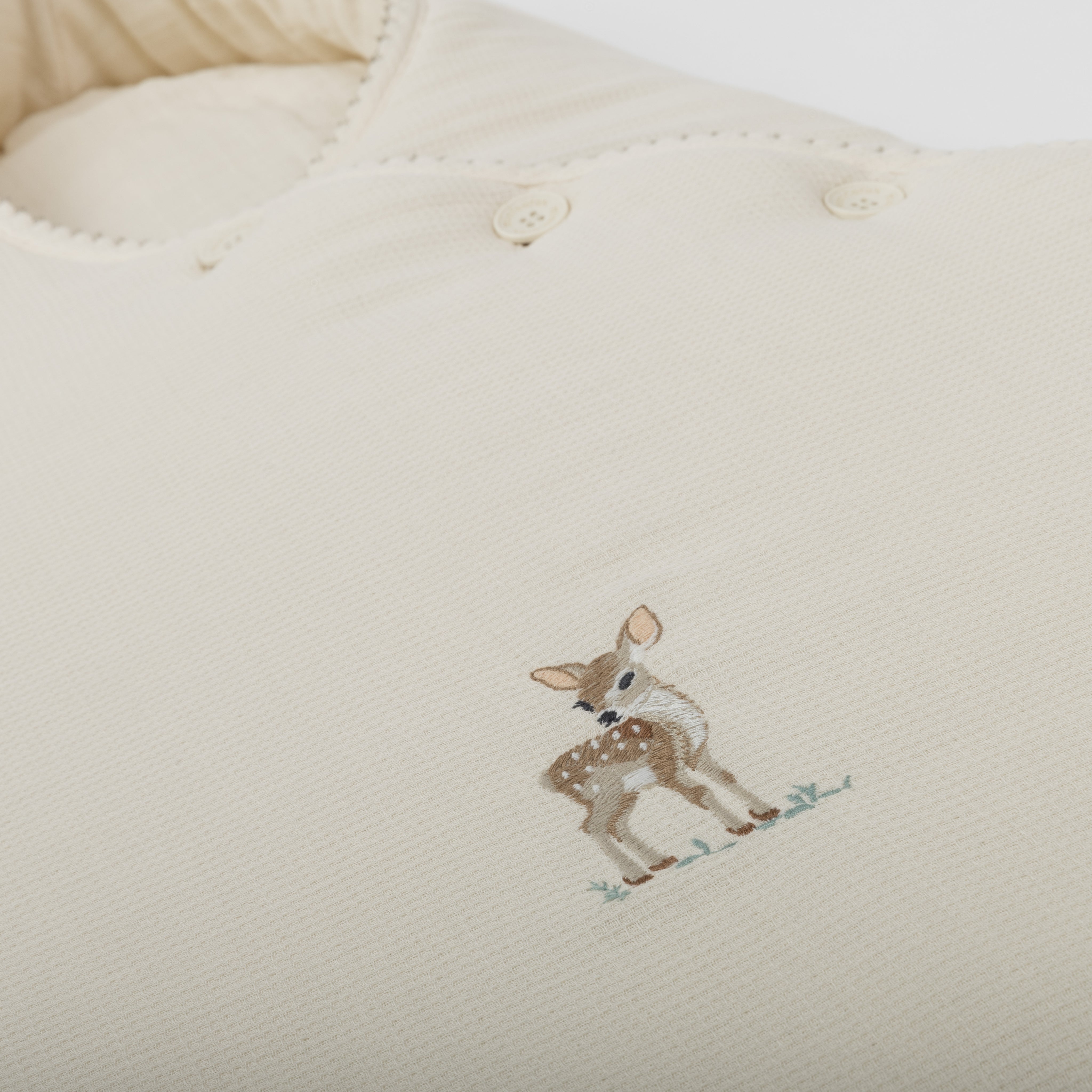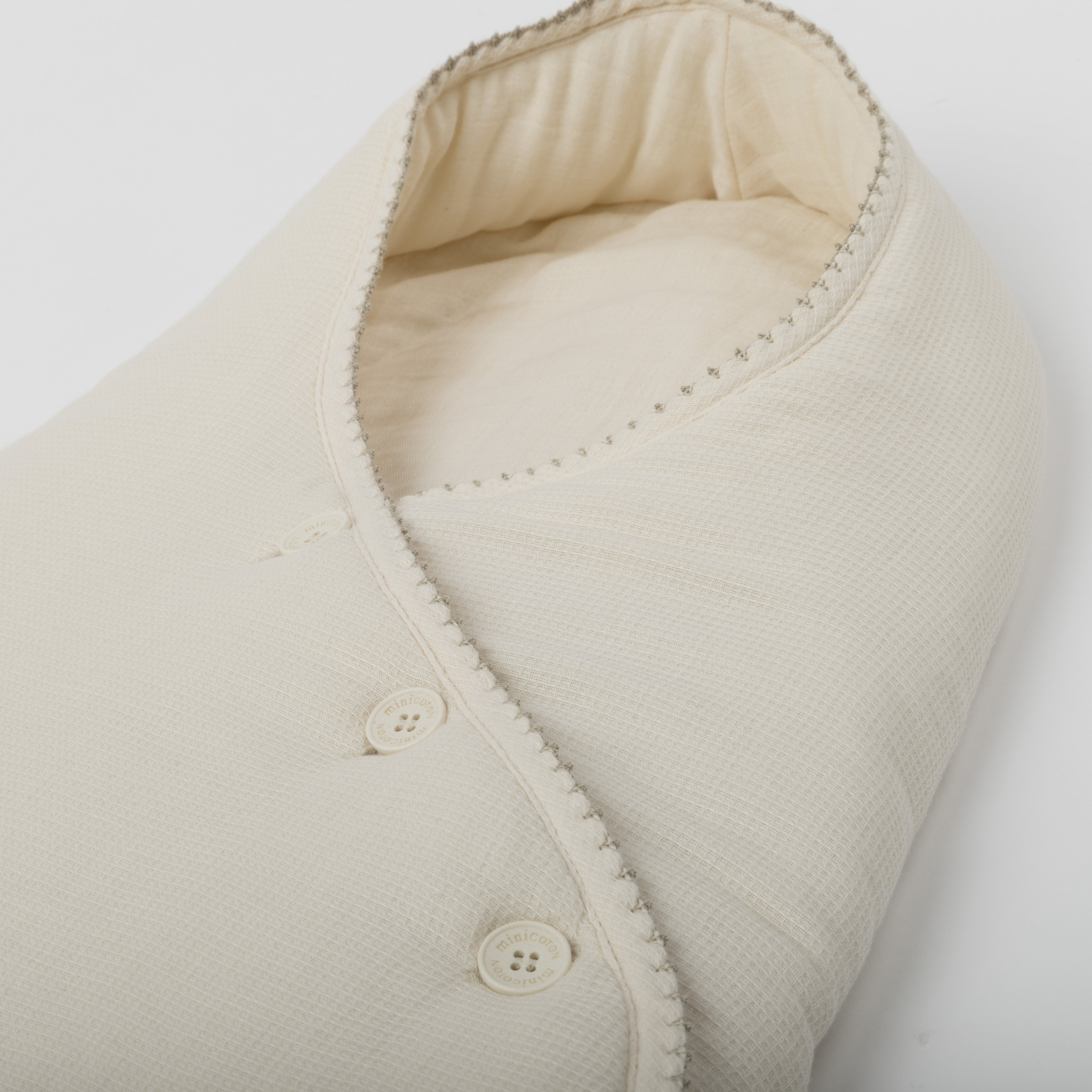 Saco para o moisés e o cesto do carrinho de passeio para os primeiros meses em que o bebé vai deitado, bordado e rematado com suave fio de algodão. É fofinho e tem três botões para ajustar o seu fecho. Os botões caracterizam-se por serem também feitos de algodão.